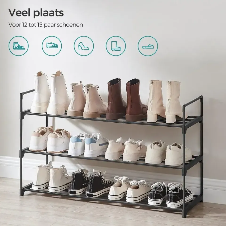 Veel schoenen: Je kan op dit rek 11 tot 15 paar schoenen plaatsen, afhankelijk van de grootte van de schoenen.