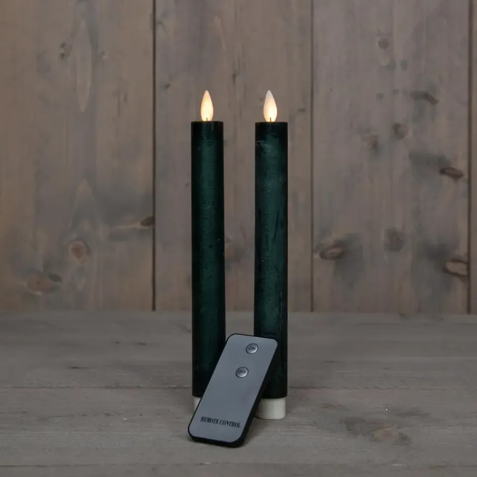 Geniet van een prachtig diner met deze LED dinerkaarsen in de kleur donkergroen! Deze set bestaat uit 2 stuks kaarsen, elk 23 cm hoog, die u gemakkelijk kunt bedienen met de bijgeleverde afstandsbediening. De kaarsen hebben een warme gloed door de warm witte verlichting en de bewegende vlam. Voeding per kaars: 2 AA batterijen (niet inbegrepen).