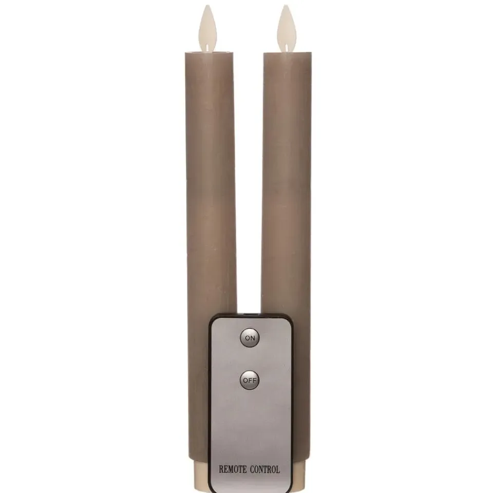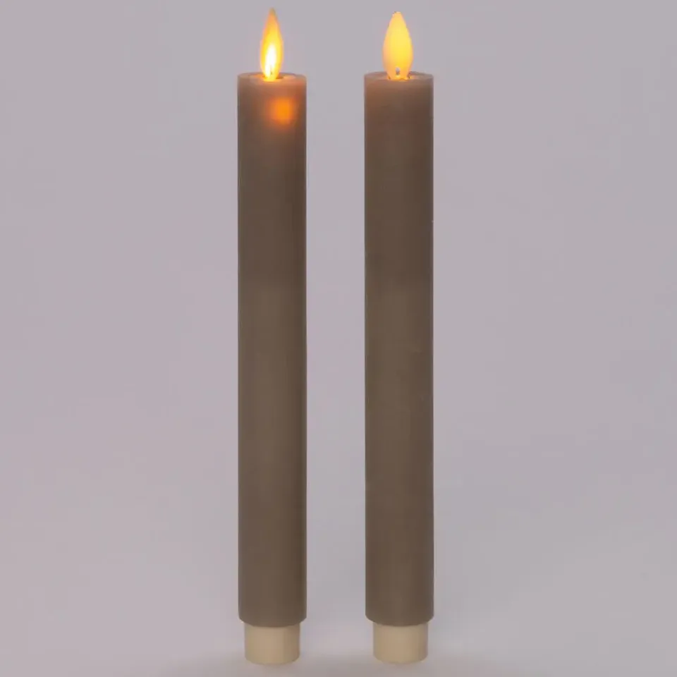 Prachtige LED dinerkaarsen in de kleur taupe/grijs. Deze set bestaat uit 2 stuks kaarsen, elk 23 cm hoog. Met de bijgeleverde afstandsbediening bedien je de kaarsen gemakkelijk. De warme gloed en bewegende vlam zorgen voor een gemoedelijke sfeer. Voeding per kaars: 2 AA batterijen (niet inbegrepen). Geniet van de perfecte sfeer met deze LED dinerkaarsen met warm wit licht.