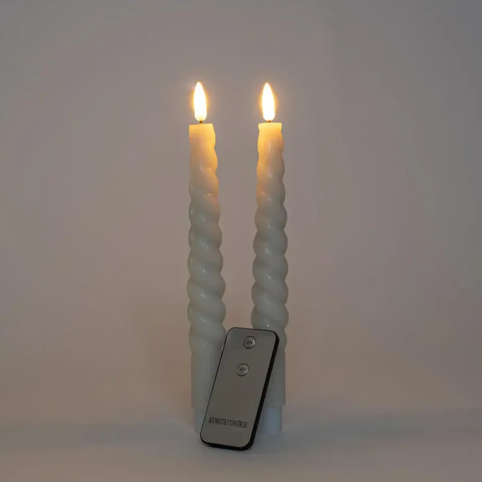 Deze swirl LED dinerkaarsen zijn de perfecte accessoire voor op tafel. Deze set bestaat uit 2 kaarsen in de kleur ivoor/creme, elk gemaakt van wax. Met een lengte van 23 cm zullen deze kaarsen perfect staan op elke tafel. De kaarsen kunnen worden bediend met een afstandsbediening, waardoor je de verlichting makkelijk kunt aan/uit zetten. Voeding per kaars: 2 AAA batterijen (niet inbegrepen). – Mooie swirl textuur- 3D vlam- luxe uitstraling- inclusief afstandsbediening