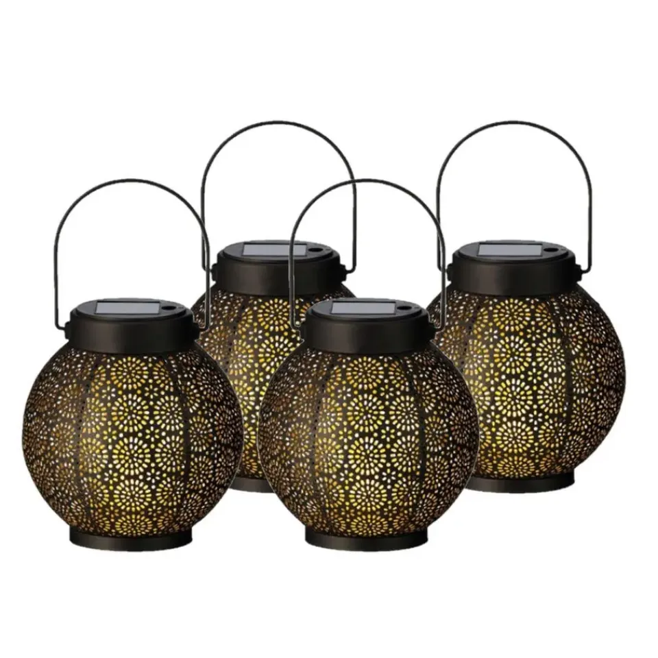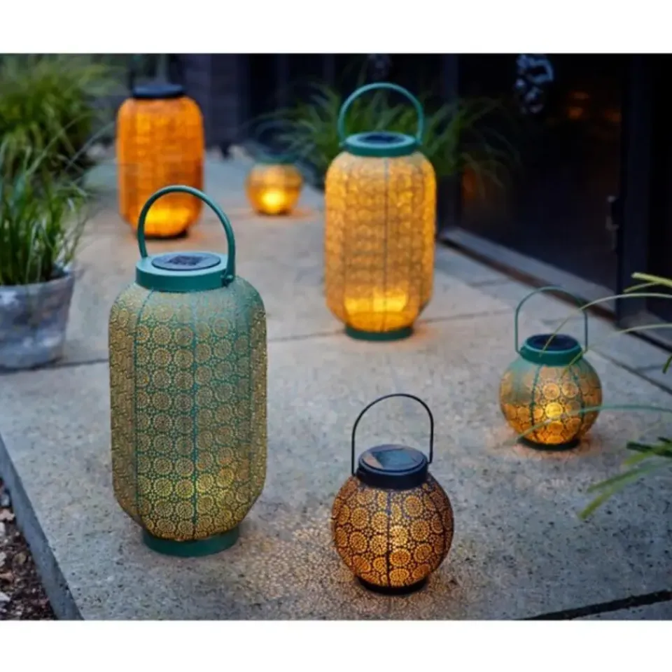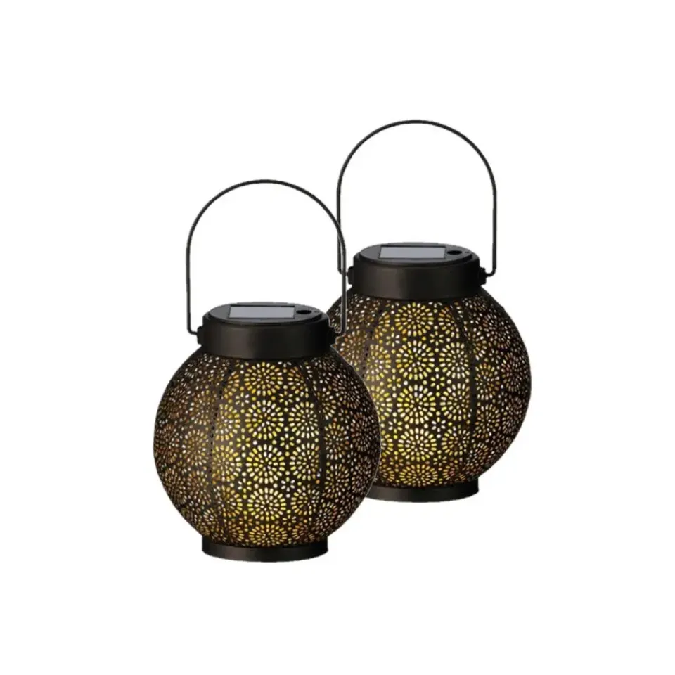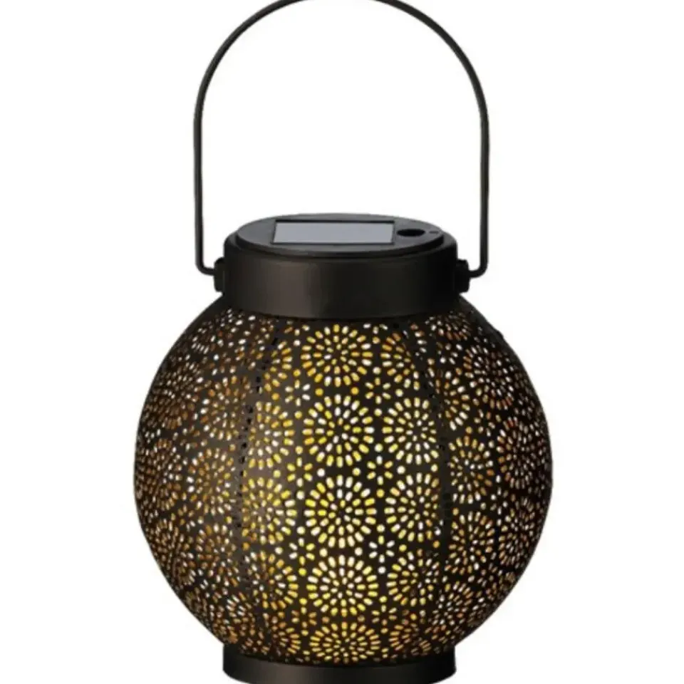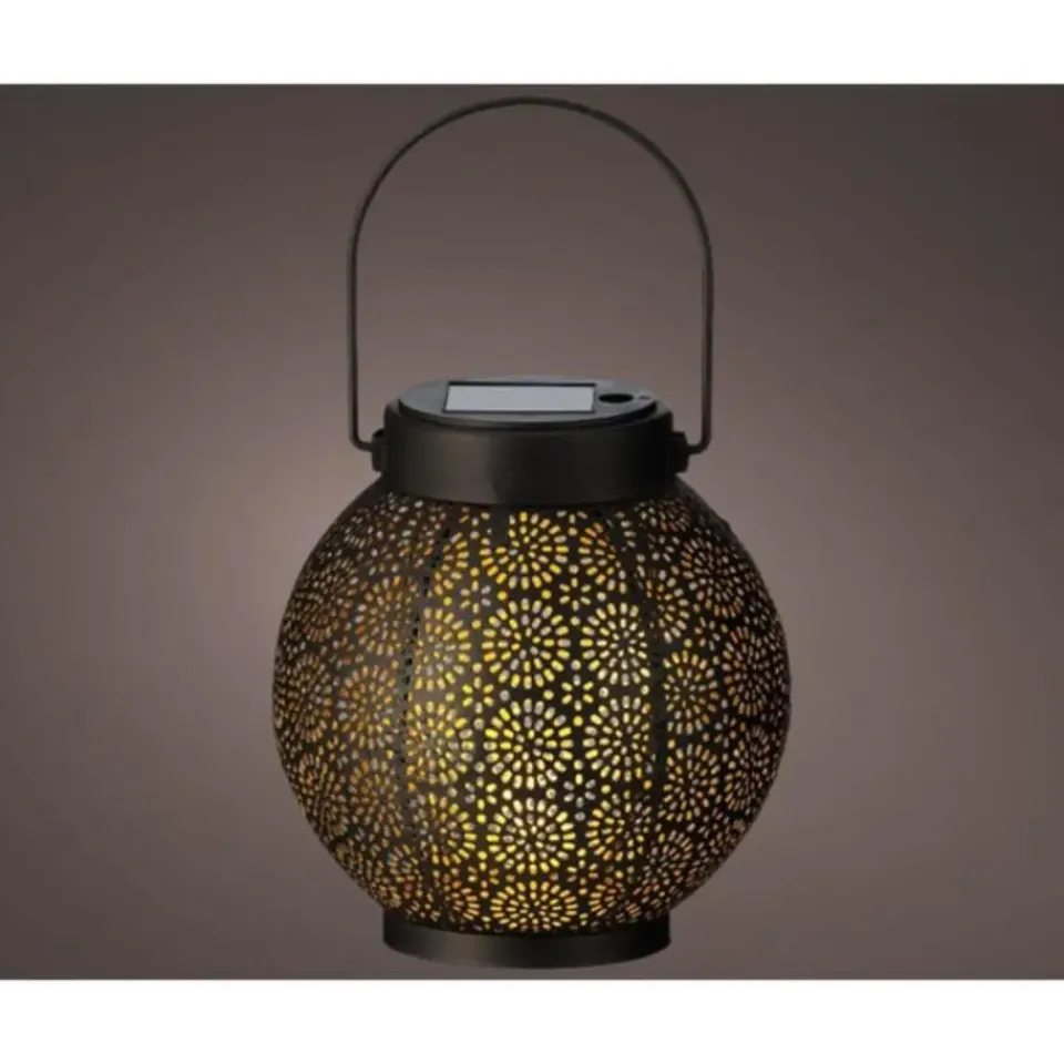 Solar lantaarn tuinverlichting met cirkel patroon. De verlichting werkt op zonne-energie waardoor het zichzelf oplaadt gedurende de dag. U kunt de lantaarn neerzetten of ophangen aan het metalen handvat voor een gezellige sfeer in de tuin, bijvoorbeeld op tafel of aan houders voor hangplanten. Formaat: 14 x 14 x 16 cm. Kleur licht: warm wit. Kleur lamp: zwart. Materiaal: metaal.