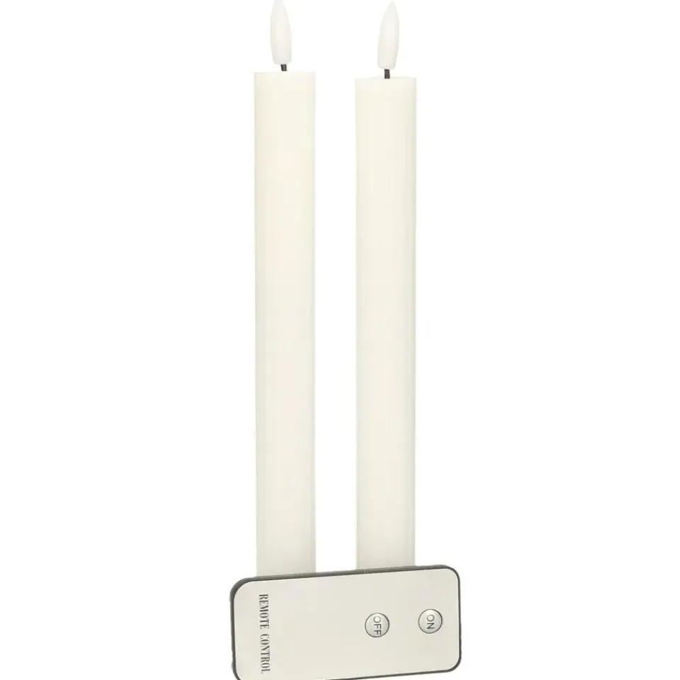 LED kaarsen/dinerkaarsen 2x stuks in de kleur wit. Deze ribbel LED dinerkaarsen zijn ongeveer 23 cm lang en geven een warm wit licht. Deze kaarsen zijn ideaal als decoratie voor elke speciale gelegenheid. Ze geven een warm, rustgevend licht en zijn veilig in gebruik. Deze LED dinerkaarsen zijn perfect om uw tafel een aangename sfeer te geven. Met 3D vlam. Voeding per kaars: 2 AAA batterijen (niet inbegrepen). Inclusief afstandsbediening om de kaarsen op afstand te kunnen bedienen.
