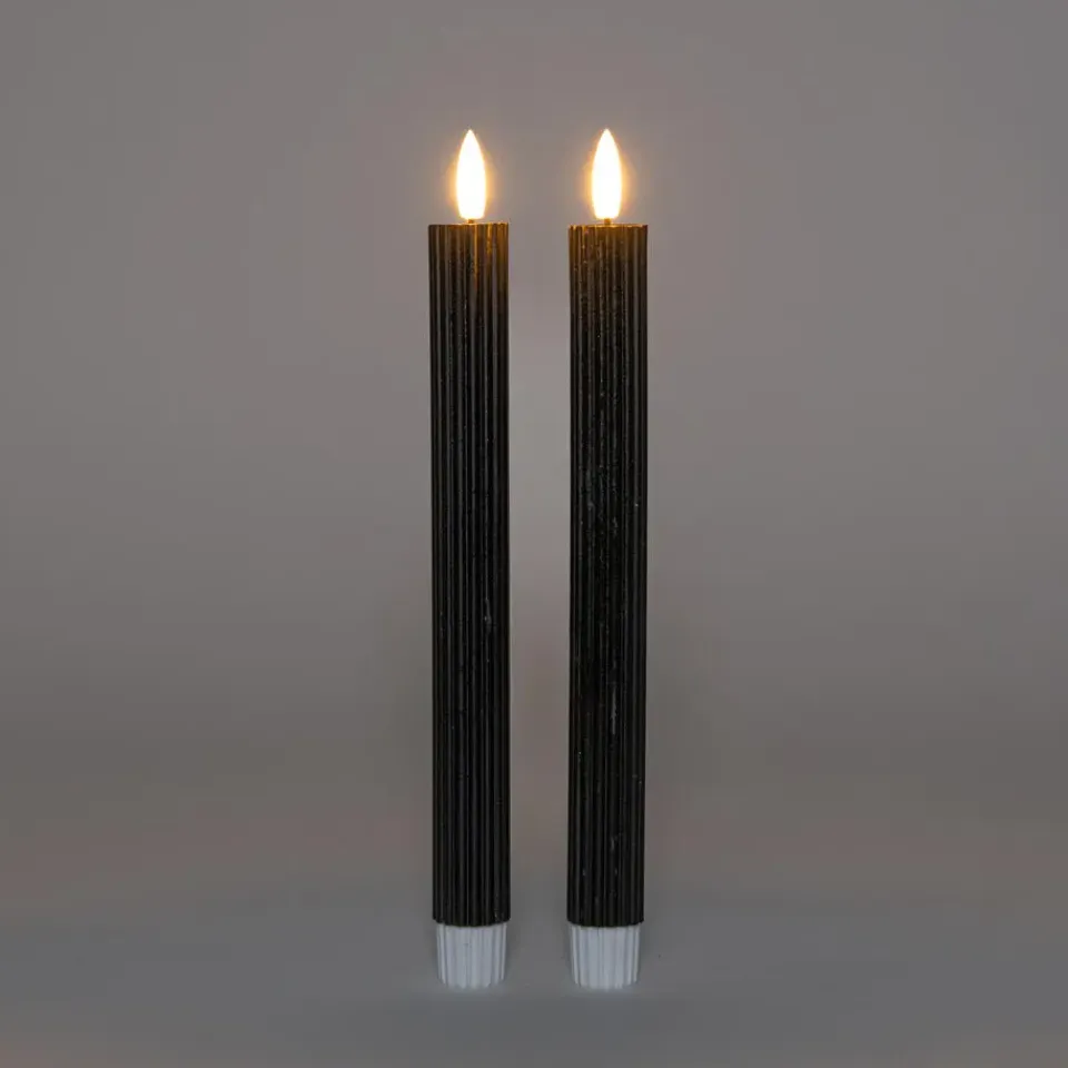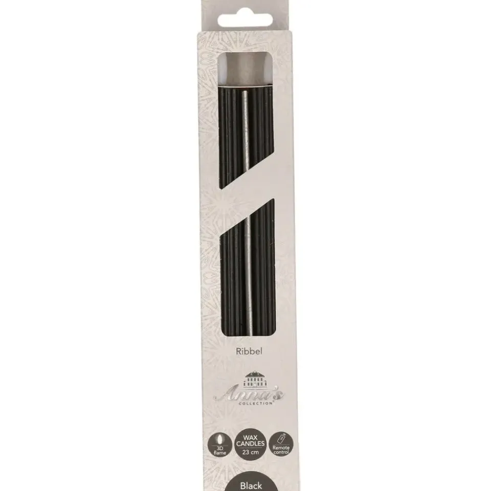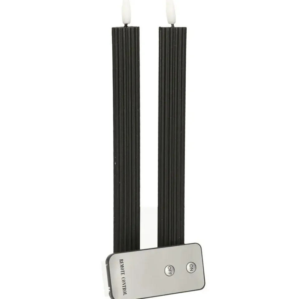 LED kaarsen/dinerkaarsen 2x stuks in de kleur zwart. Deze ribbel LED dinerkaarsen zijn ongeveer 23 cm lang en geven een warm zwart licht. Deze kaarsen zijn ideaal als decoratie voor elke speciale gelegenheid. Ze geven een warm, rustgevend licht en zijn veilig in gebruik. Deze LED dinerkaarsen zijn perfect om uw tafel een aangename sfeer te geven. Met 3D vlam. Voeding per kaars: 2 AAA batterijen (niet inbegrepen). Inclusief afstandsbediening om de kaarsen op afstand te kunnen bedienen.