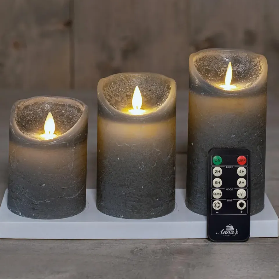 Anna’s Collection LED kaarsen 3x stuks in de kleur grijs. Breng de warmte en elegantie van kaarslicht in je interieur met deze luxe oplaadbare LED stompkaarsen. Deze set van kaarsen is gemaakt van echte wax en voorzien van een levensechte bewegende vlam, die een sfeervol en realistisch effect geeft – zonder rook, hitte of gesmolten was.
