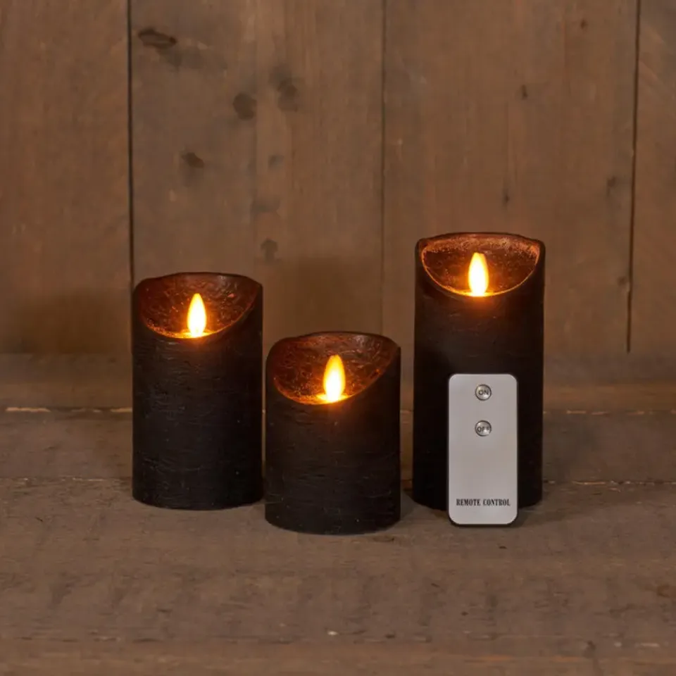 Kaarsen set van 3x stuks LED stompkaarsen in de kleur zwart. Deze set van rustieke LED stompkaarsen zijn gemaakt van echt wax en hebben een bewegende vlam, waardoor ze nauwelijks te onderscheiden zijn van echte kaarsen. Ideaal voor een veilige en sfeervolle verlichting in elke kamer.