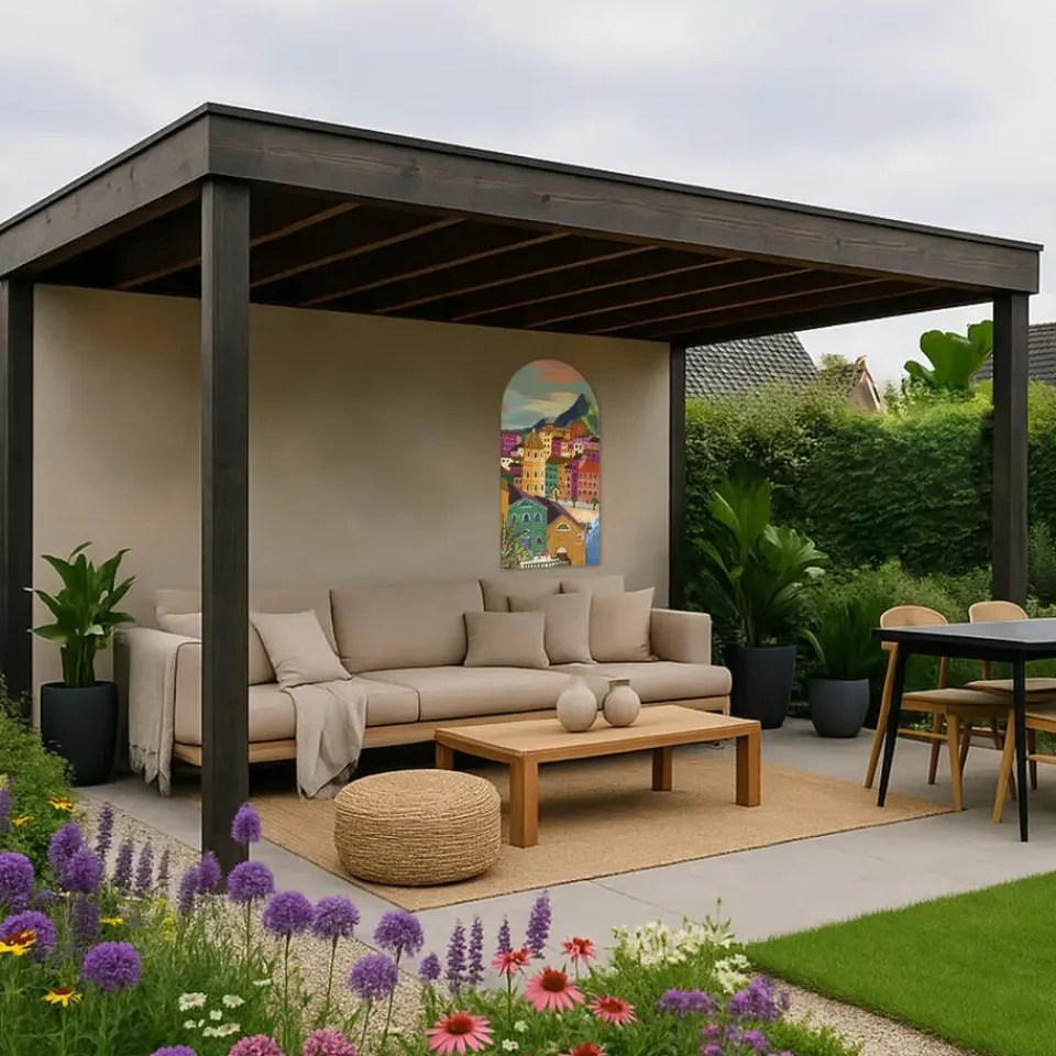 De afgeronde vorm geeft een verrassend zachte uitstraling, terwijl de rijke kleuren en verfijnde details zorgen voor een eigentijdse twist. Of je nu kiest voor mediterrane straatjes in warme tinten, serene Japanse taferelen of kleurrijke fantasiedorpen, elk canvas vertelt een verhaal dat uitnodigt tot wegdromen.