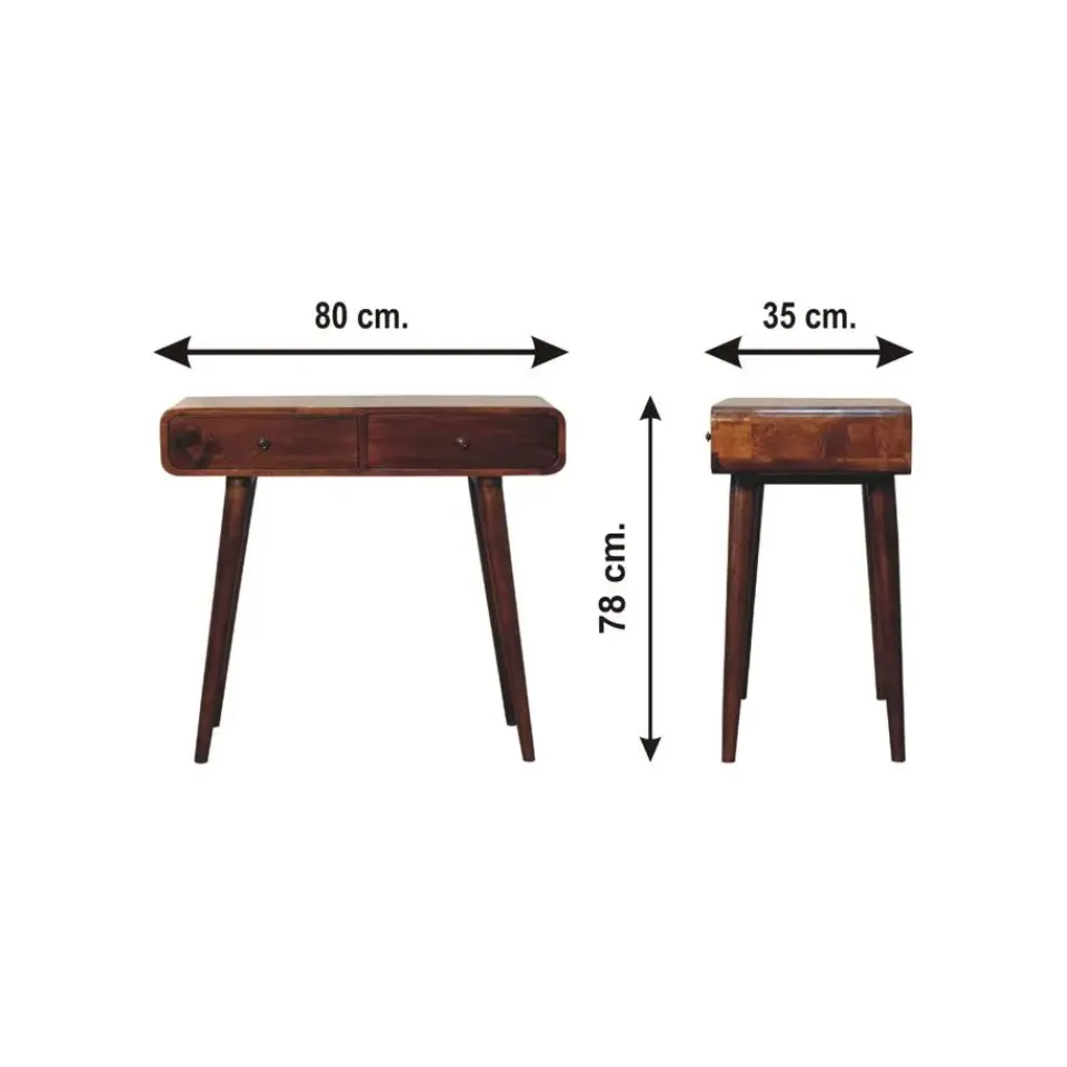 Deze eenvoudige, elegante Sidetable heeft prachtig gebogen randen die perfect passen in elke leefruimte. Deze eenheid van 100% massief mango-hout is gebouwd met duurzaam verkregen hout en heeft twee lades om uw huis georganiseerd te houden door kleine huishoudelijke voorwerpen op te bergen. Het heeft glanzende knoppen en heeft een fijne kastanjebruine afwerking met 4 Nordic-stijl poten.