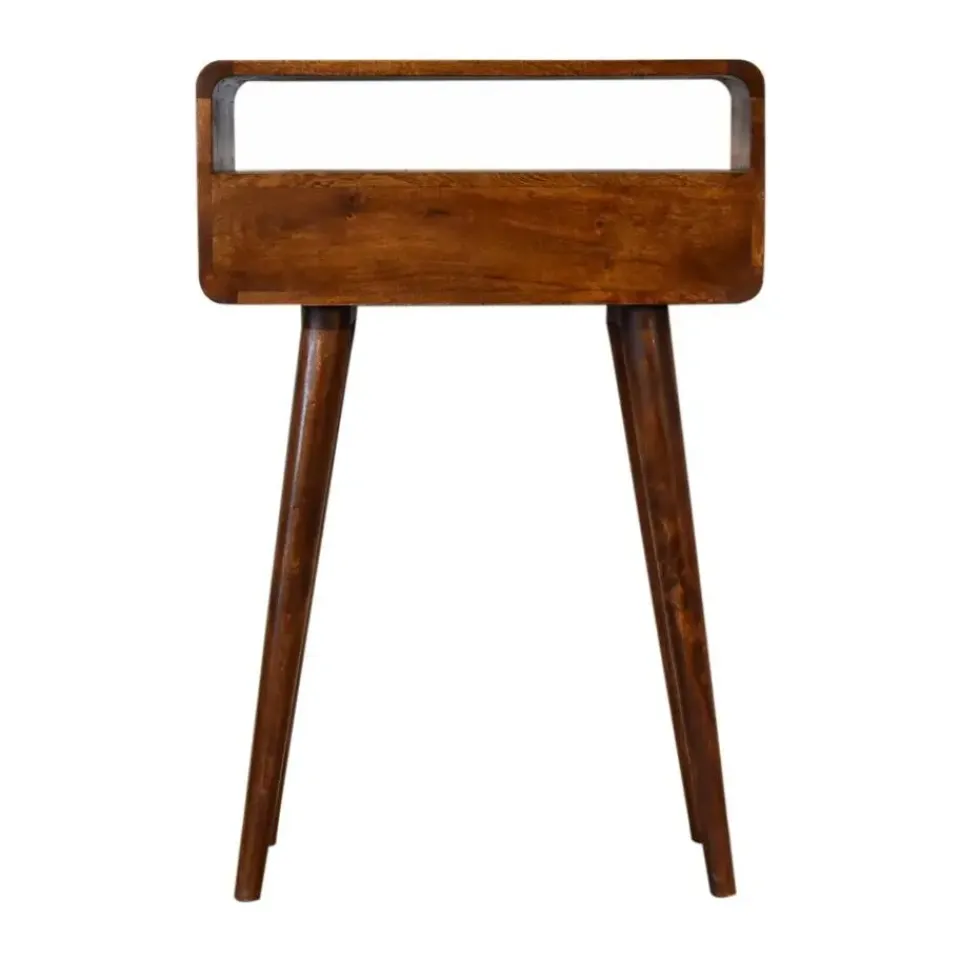 De mini-versie van onze populaire IN311. Deze eenvoudige en elegante console heeft gebogen randen, twee lades en een open vak, glanzende knoppen en vier Scandinavische poten. Afgewerkt in kastanje. Onderdeel van de Recession Collection.