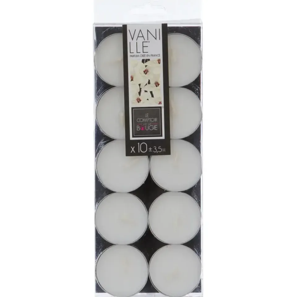 Aantal kaarsen: 10x. Formaat per stuk: diameter 3,7 cm, hoogte 1,5 cm. Aantal branduren per stuk: 3,5 uur. Materiaal: wax/was, paraffine, aluminium. Geur type: Vanille-geur wordt vaak omschreven als zoet, warm en romig, met een licht kruidige ondertoon. Het kan ook een gevoel van comfort en geborgenheid oproepen.