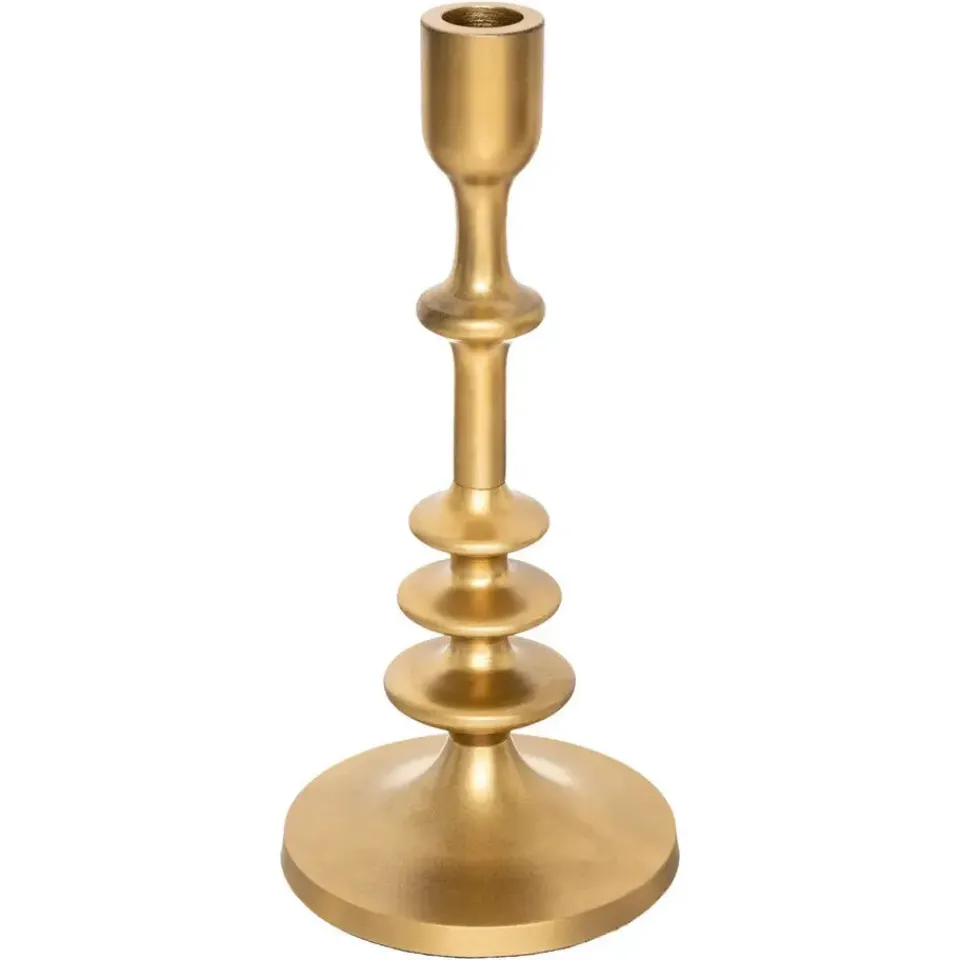 De kandelaar staat stevig op een brede voet en combineert een tijdloos design met een warme gouden kleur. Dankzij het hoge model is het een opvallend decoratief element dat in bijna alle interieurstijlen past. Perfect voor sfeervolle verlichting op tafel, dressoir of vensterbank.