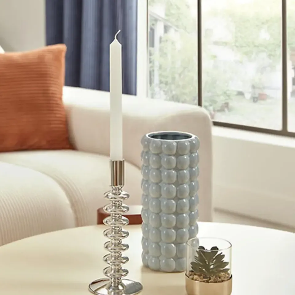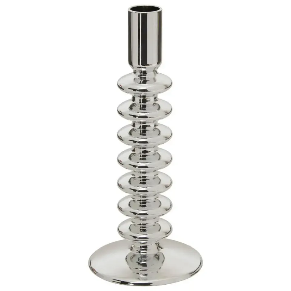 De kandelaar staat stevig op een brede voet en combineert een tijdloos design met een warme zilveren kleur. Dankzij het hoge model is het een opvallend decoratief element dat in bijna alle interieurstijlen past. Perfect voor sfeervolle verlichting op tafel, dressoir of vensterbank.