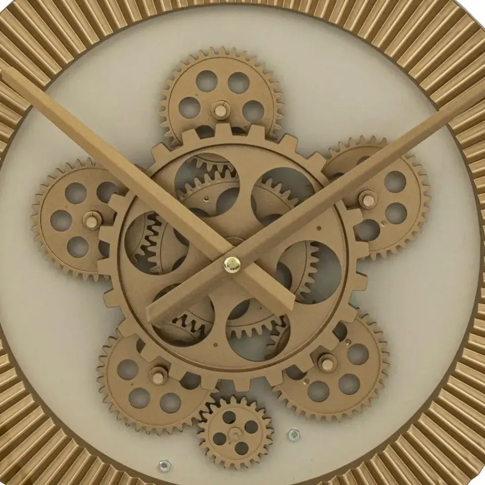 Wandklok Roma Dua Vintage Metal voor aan de muur/wand in de huis/studeerkamer met een diameter van 50 cm en dikte 8 cm. Grote klok met zichtbare en werkzame tandwielen. Kleuren: beige/goud/transparant glas. Met Romeinse cijfers. Aan de achterkant zit een ophanging(bevestigingsmateriaal niet inbegrepen). Materiaal: metaal/kunststof/glas. Voeding: 2x AA-batterij, niet inbegrepen. Gewicht: 3.5 kilo. Dit klok ornament geeft meteen een fijne sfeer, met een mix van gevoelens tussen nu en toen. Mooie luxe klok, een blikvanger.