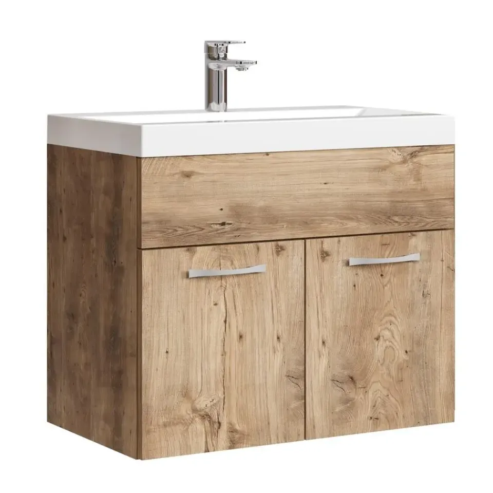 Badkamermeubel set Montreal inclusief wastafel.Deze set geeft iedere badkamer, groot of klein, extra bergruimte en een moderne en luxe uitstraling. Vanwege zijn strakke afwerking is het meubel gemakkelijk schoon te maken.De set is uitgevoerd in kastanje eiken en is gemakkelijk te monteren. De kast is gemaakt van spaanplaat en de wastafel van kunstmarmer.