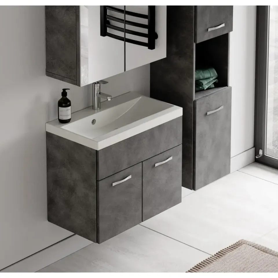 Badkamermeubel set Montreal inclusief, wastafel en spiegelkast en kolomkast.Vanwege zijn strakke afwerking is het meubel gemakkelijk schoon te maken.De set is uitgevoerd in donker grijs en is gemakkelijk te monteren.