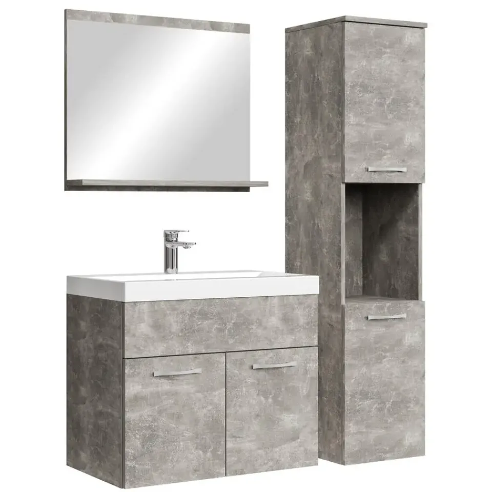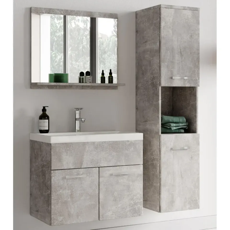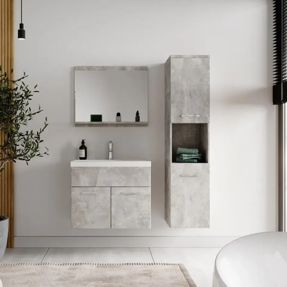 Badkamermeubel set Montreal inclusief wastafel en spiegel en kolomkast.Deze set geeft iedere badkamer, groot of klein, extra bergruimte en een moderne en luxe uitstraling. De deuren van de kolomkast kunnen tijdens montage linksdraaiend of rechtsdraaiend geplaatst worden. Vanwege zijn strakke afwerking is het meubel gemakkelijk schoon te maken.De set is uitgevoerd in beton grijs en is gemakkelijk te monteren. De kast is gemaakt van spaanplaat en de wastafel van kunstmarmer.