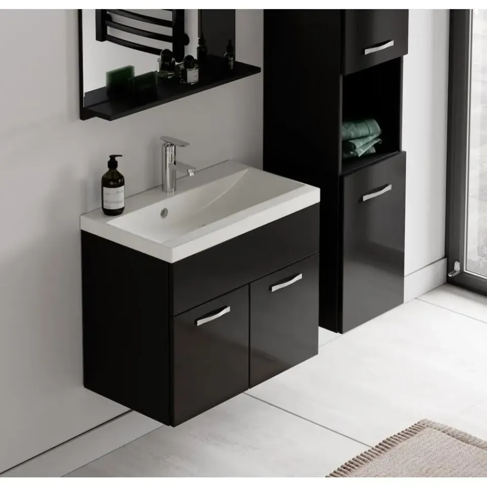 Badkamermeubel set Montreal inclusief wastafel en spiegel en kolomkast.Deze set geeft iedere badkamer, groot of klein, extra bergruimte en een moderne en luxe uitstraling. De deuren van de kolomkast kunnen tijdens montage linksdraaiend of rechtsdraaiend geplaatst worden. Vanwege zijn strakke afwerking is het meubel gemakkelijk schoon te maken.De set is uitgevoerd in zwart met hoogglans fronten en is gemakkelijk te monteren. De kast is gemaakt van spaanplaat en de wastafel van kunstmarmer.