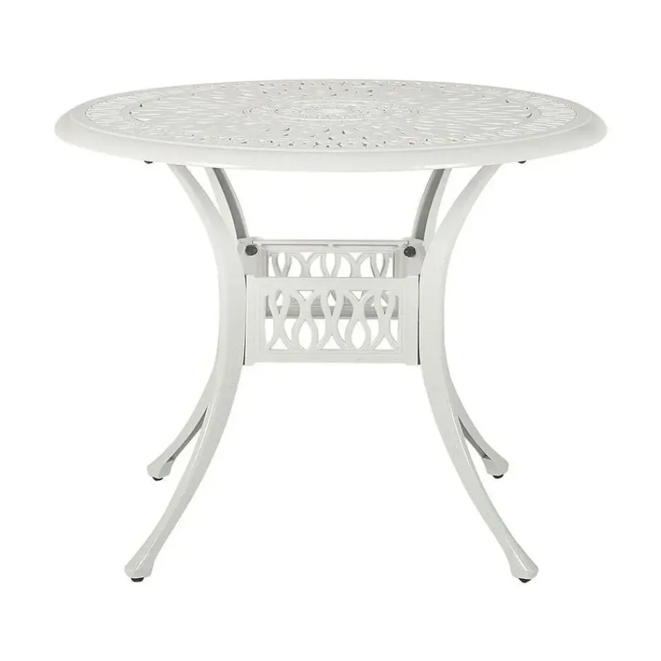 Belangrijkste eigenschappen: Tafelblad met gat voor parasol, Tijdloos design, Hoogwaardig materiaal, Solide afwerking, Gemaakt van natuurlijke, weerbestendige materialen, Roestvrijstalen frame