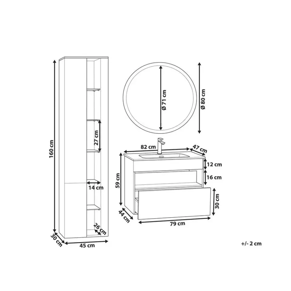 Aanbod omvat: 1 x wastafelkast, 1 x Spiegel, 1 x Wandplank, 1 x Wastafel, Niet inbegrepen: Kranen