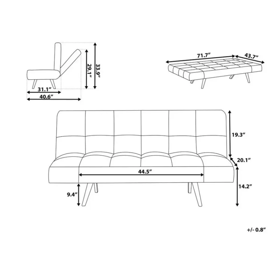Belangrijkste eigenschappen: Zeer gemakkelijk te veranderen in een bed, Brede, dik gestoffeerd zitvlak, Trendy design en kleur, Past uitstekend in elk interieur, Verstelbare armleuningen, Verstelbare rugleuning