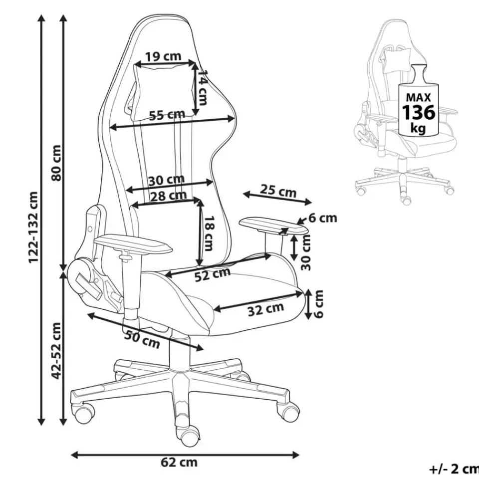 Belangrijkste eigenschappen: 360° draaibaar, Soepel rollende nylon wieltjes, Verstelbare rugleuning tot 180°, Comfortabel memory foam zitkussen, Zwenkwielen uitgerust met automatische veiligheidsremfunctie, Ergonomische vorm, Comfortabel gevormde armleuningen, Onderhoudsvriendelijk en duurzaam materiaal