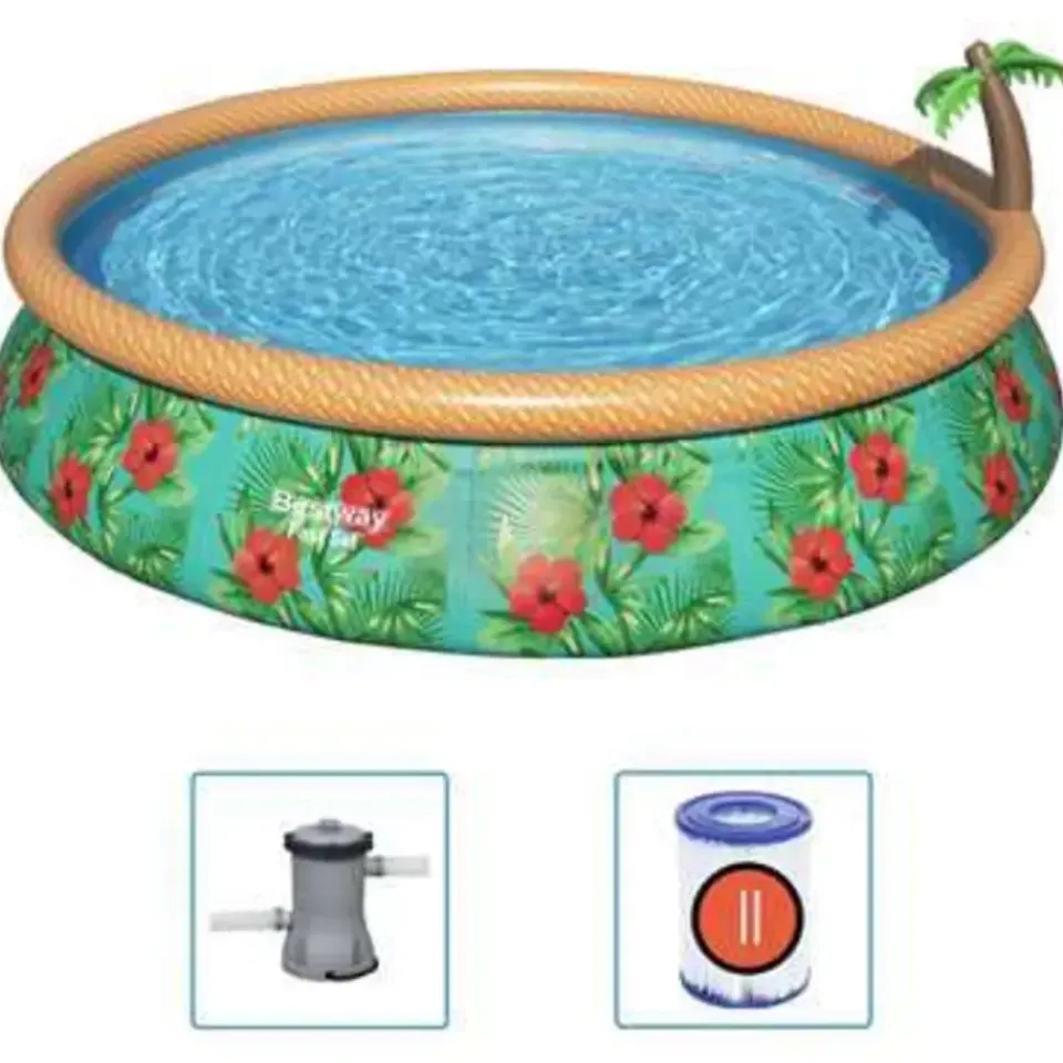 Je beleeft veel speel- en spetterplezier in je eigen achtertuin met deze Bestway Fast Set opblaasbare Paradise Palms zwembadset! Het stijlvolle zwembad heeft versterkte Tritech wanden. Tritech is een versterkt 3-laags materiaal dat bestaat uit gelamineerd robuust PVC en polyester mesh. Dit opblaaszwembad is snel en eenvoudig op te zetten. Leg het zwembad op een plat oppervlak, blaas de bovenring op en vul het zwembad met water. De palmboom is opblaasbaar en kan water sproeien wanneer hij op een tuinslang is aangesloten. Het ingebouwde uitstroomventiel maakt het eenvoudig om water af te tappen door het ventiel aan een tuinslang te bevestigen met de inbegrepen adapter. De filterpatroonpomp is een onderdeel van het circulatiesysteem om het water schoon te houden en te voorkomen dat algen, schimmels en andere microbiële bacteriën in je zwembad groeien.