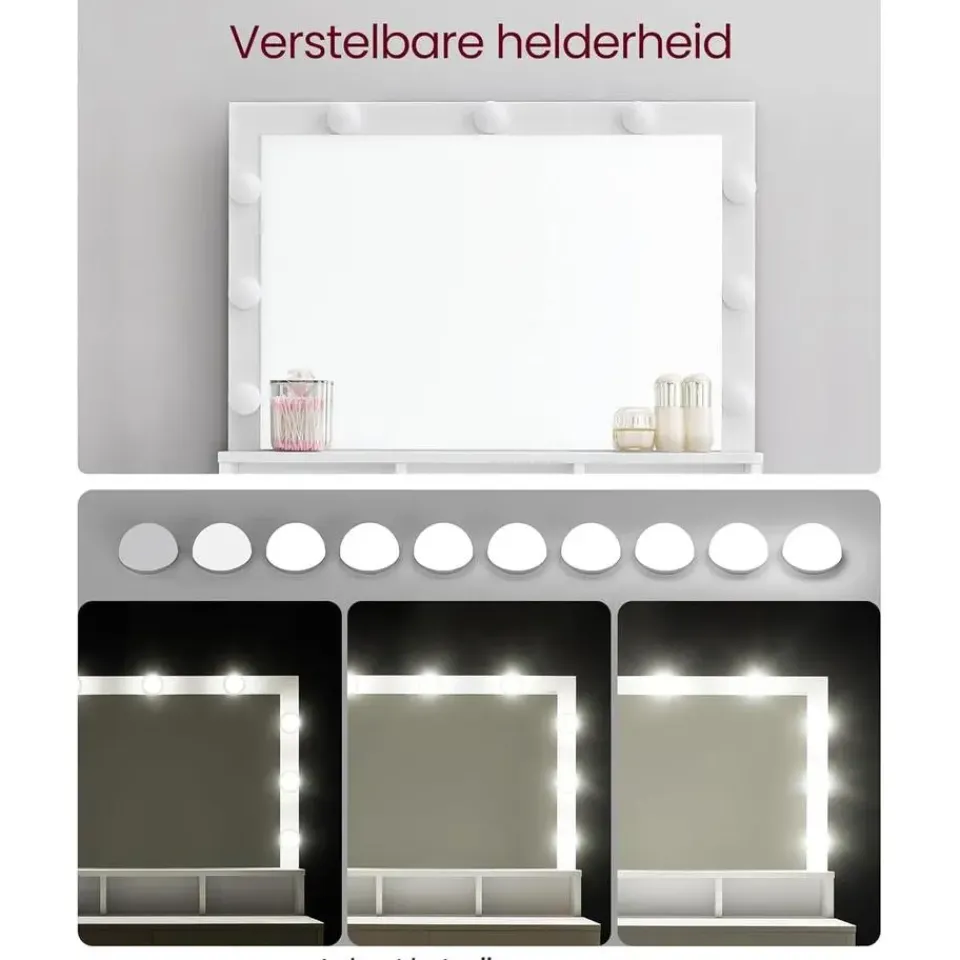 Dankzij de 9 dimbare LED-lampen rondom de spiegel heb je altijd de juiste verlichting voor je make-uproutine. Pas de helderheid eenvoudig aan en creėer een vlekkeloze look, elke dag opnieuw.