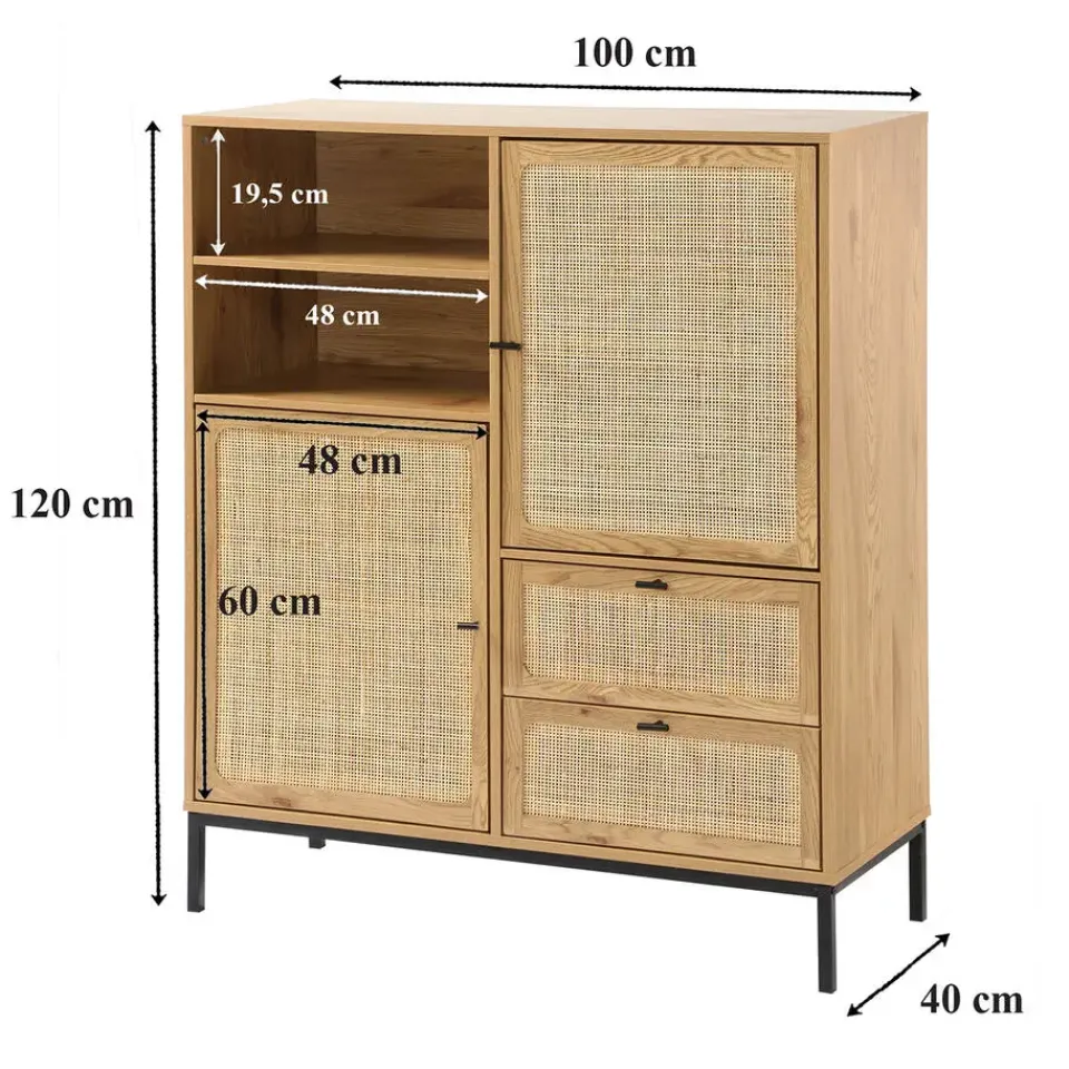 Ontdek dit prachtige hoge buffetkast met natuurlijke rotan fronten. Het exotische ontwerp past bij elk interieur en geeft een stijlvolle uitstraling aan je kamer. Dit buffet heeft verschillende opbergmogelijkheden: 2 deuren, 2 laden en 2 vakken om al je spullen in op te bergen. Productkenmerken : Natuurlijke rotan fronten. 2 deuren met 1 plank achter elke deur. 2 vakken. 2 laden gemonteerd op kogelgeleiders. Metalen poten en handgrepen. Zelfbouwmeubel: zelf te monteren. Productafmetingen : Lengte: 100 cm x Breedte: 40 cm x Hoogte: 120 cm – Nettogewicht: 39,5 kg. Verpakkingsafmetingen : Pakket nr. 1: Lengte: 108,5 cm x Hoogte: 12,5 cm x Diepte: 46 cm – Gewitch : 20kg. Pakket nr. 2: Lengte: 109,5 cm x Hoogte: 11,5 cm x Diepte: 55 cm – Gewitch : 21,5kg. Totaal bruto gewicht : 41,5 kg.