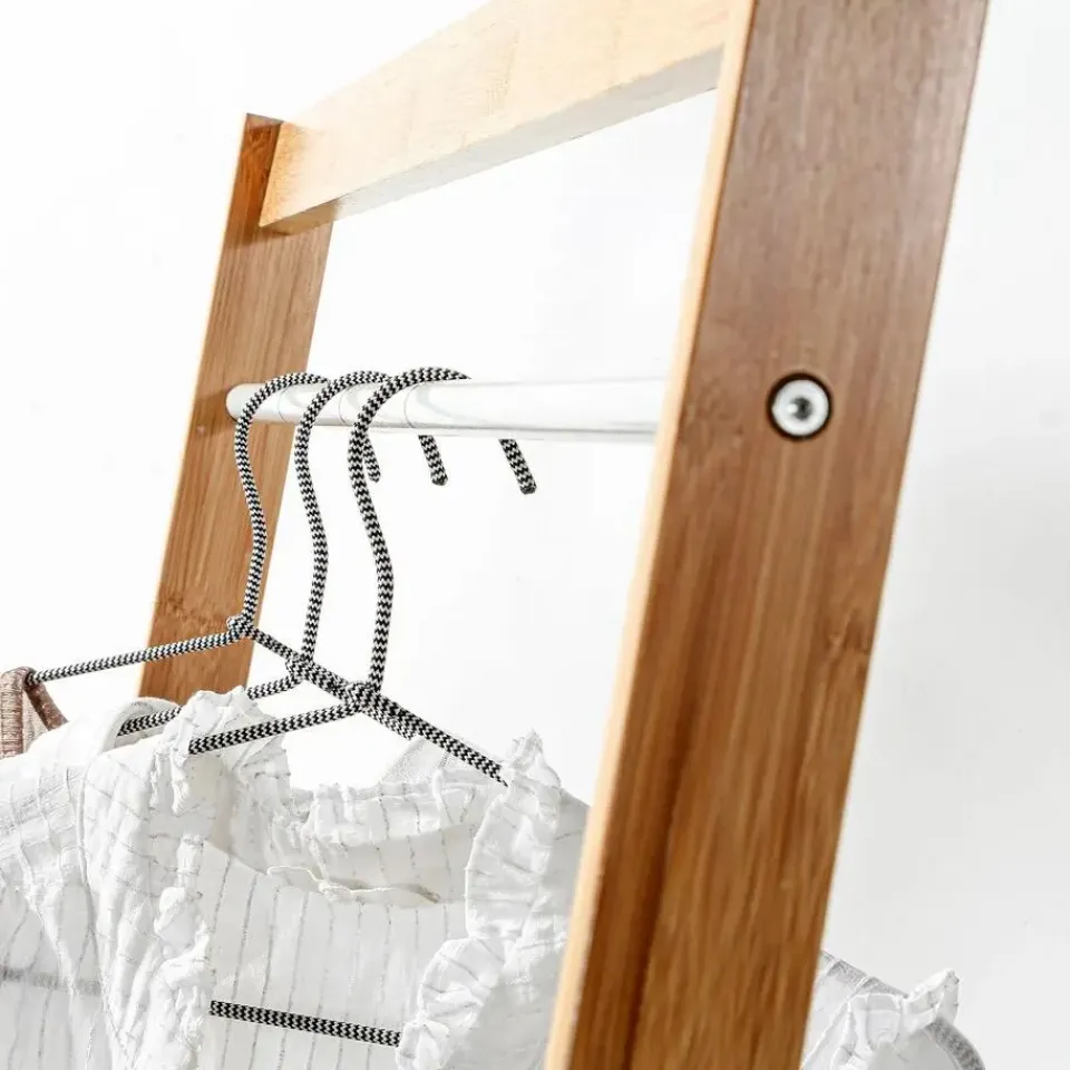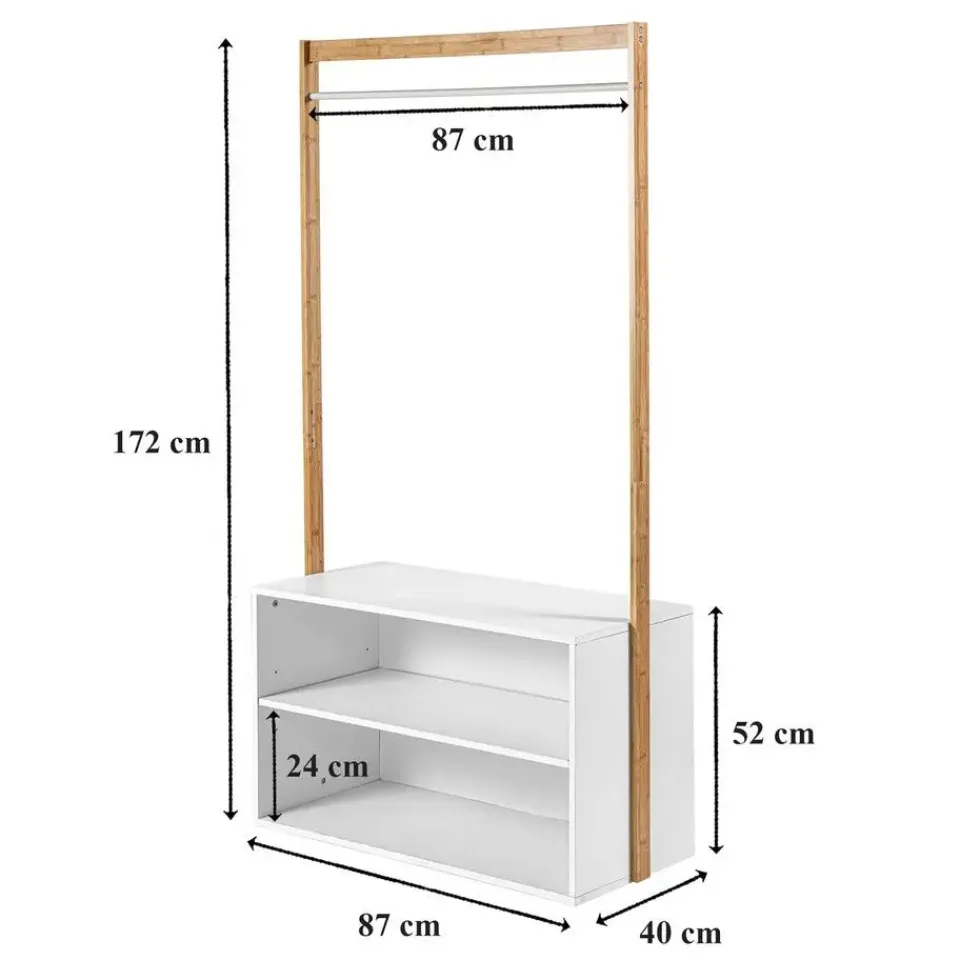 Deze garderobe van bamboe geeft uw entree een natuurlijk en trendy tintje. U kunt er jassen, tassen en sjaals in ophangen. Het zal er geweldig uitzien in uw huis of kantoor en zal perfect zijn om uw schoenen of andere meubelstukken op te hangen. Kenmerken van de kledingkast met opbergruimteMateriaal: bamboe, melamine panelen Afmetingen: 90 x 40 x 171 cm Gewicht: 20,2 kg