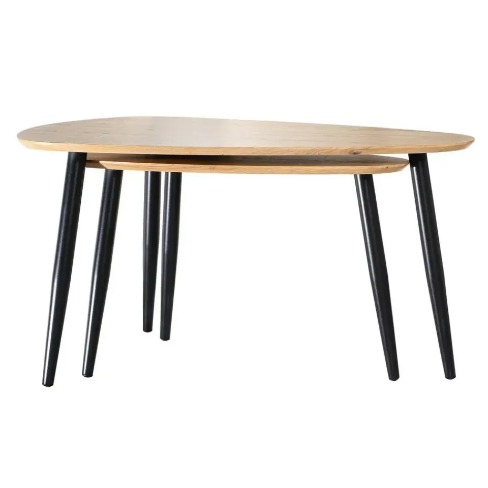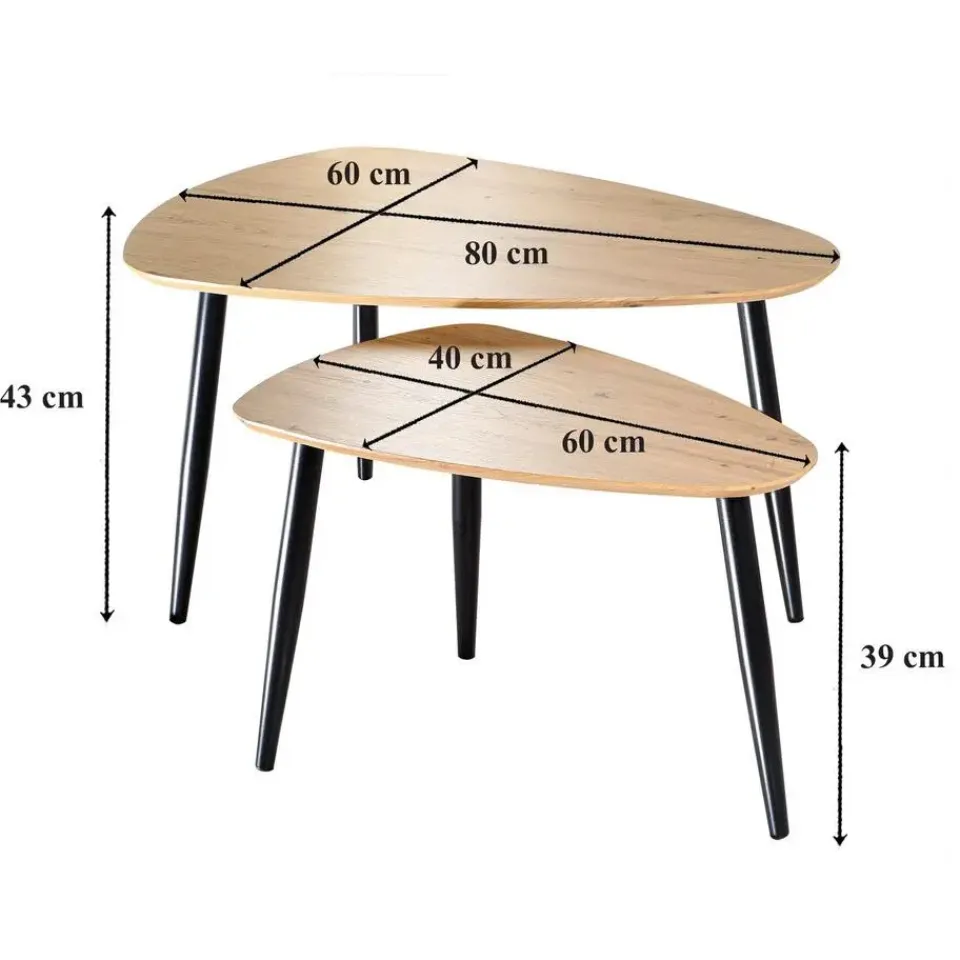 Productkenmerken: Set van 2 salontafels. MDF-bladen bedekt met decoratief papier met houten uitstraling. Zwarte metalen poten. FSC-label garandeert duurzaam bosbeheer van het product. Productafmetingen: Grote tafel: Breedte 60 cm x Lengte 80 cm x Hoogte 42 cm. Kleine tafel: Breedte 40 cm x Lengte 60 cm x Hoogte 38 cm. Nettogewicht: 8,1 kg. Verpakkingsafmetingen: Breedte 88,5 cm x Lengte 67,5 cm x Hoogte 9,5 cm – Nettogewicht: 9,1 kg.