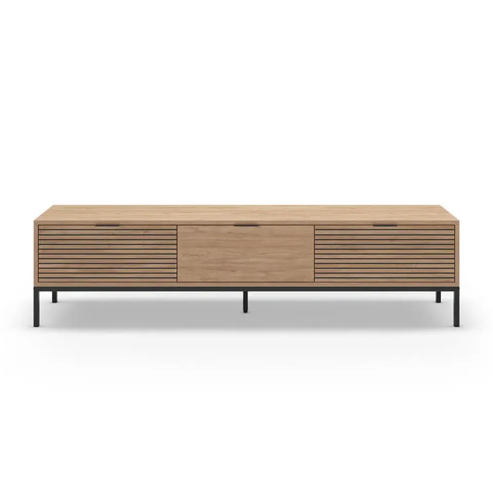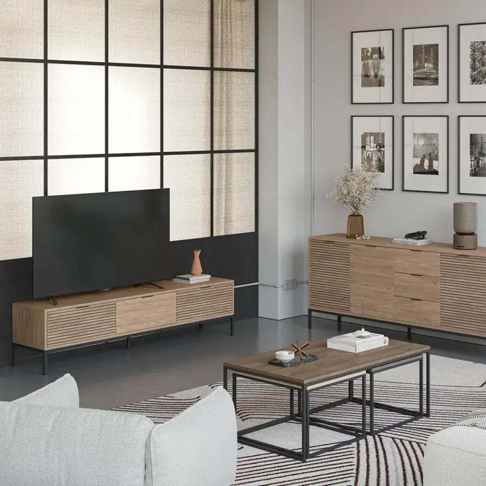 Productkenmerken: Gemaakt van 18 mm gelamineerde spaanplaten. Eiken kleur met zwarte groeven. Zwarte metalen poten en fijne zwarte metalen handgrepen. Ontdek de ARIEL TV-meubel, een eyecatcher die je woonkamer transformeert in een industriële en moderne ruimte. Dit meubel biedt voldoende opbergruimte voor het organiseren van elektronische apparatuur en decoratieve objecten. Productafmetingen: Lengte 180 cm x breedte 40 cm x hoogte 55 cm – Nettogewicht: 39,9 kg. Verpakkingsafmetingen: Verpakking 1: Lengte 187 cm x breedte 44,5 cm x hoogte 8,5 cm – Brutogewicht: 28,06 kg. Verpakking 2: Lengte 67,5 cm x breedte 44 cm x hoogte 12 cm – Brutogewicht: 15,4 kg. Totaal brutogewicht: 43,46 kg.