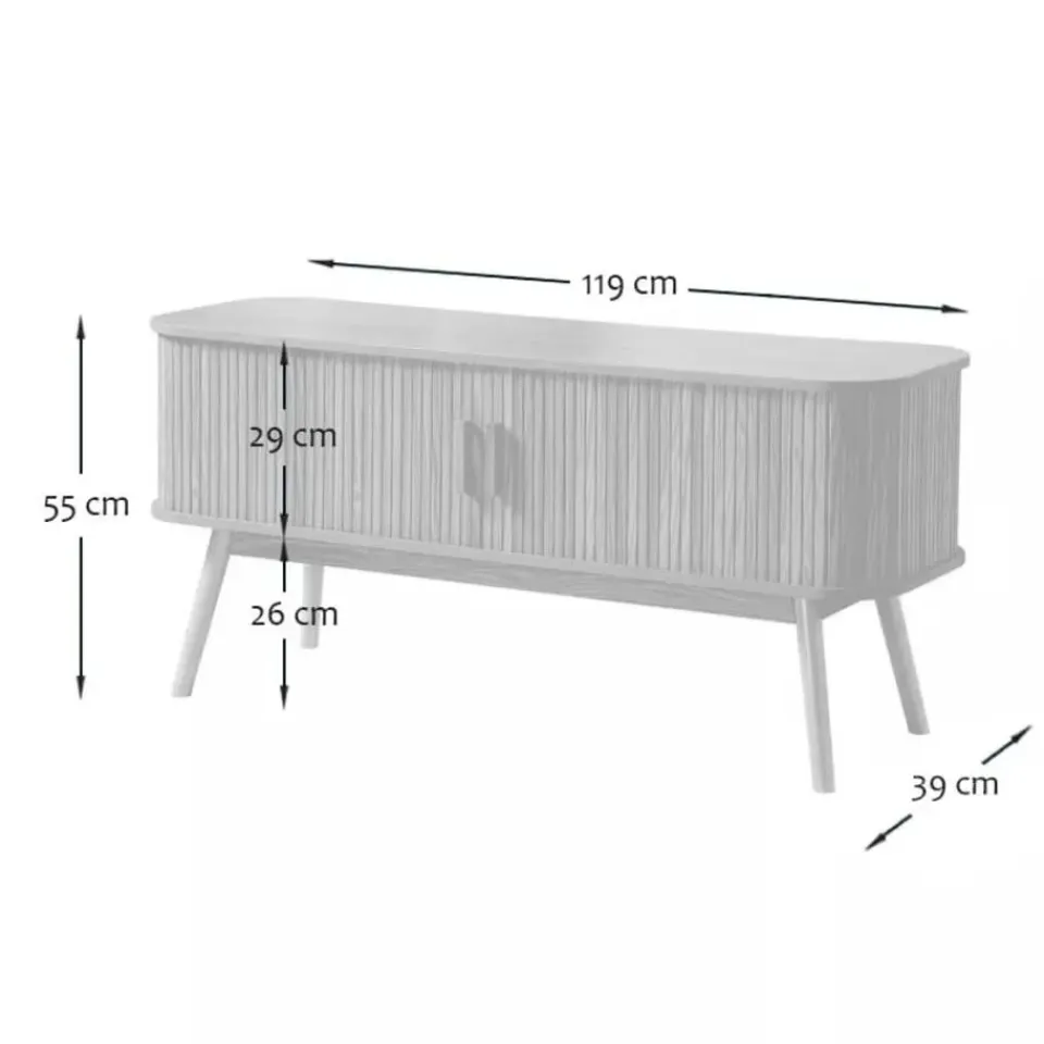 Productkenmerken: Tv-meubel met 2 schuifdeuren gemaakt van spaanplaat. 1 verticale scheiding. Eiken effect decor. Echte houten handgreep. 4 poten van echt hout bedekt met eiken decor. Productafmetingen: Breedte 39 cm x Lengte 119 cm x Hoogte 55 cm – Nettogewicht: 21,3 kg. Afmetingen van het pakket: Breedte 46 cm x Lengte 128 cm x Hoogte 15 cm – Nettogewicht: 23,9 kg.