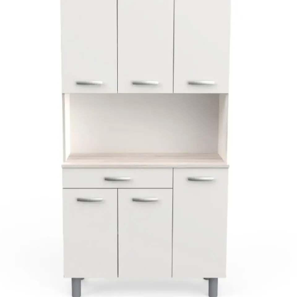 Het neutrale ontwerp van deze buffetkast maakt dat hij gemakkelijk geïntegreerd kan worden in bijna elk interieur. De kast krijgt karakter door het werkblad in prachtig acaciadecor. Deze ruime buffetkast heeft een lade voor uw bestek en 6 draaideuren met daarachter opbergruimte voor uw servies, kookpotten, voorraad en keukengerei. In het open vak kan een microgolfoven, koffiemachine of andere keukenapparatuur geplaatst worden. Buffetkast Pavel is een veelzijdige uitbreiding voor uw keuken! Schroeven en pluggen voor wandmontage zijn niet inbegrepen.
