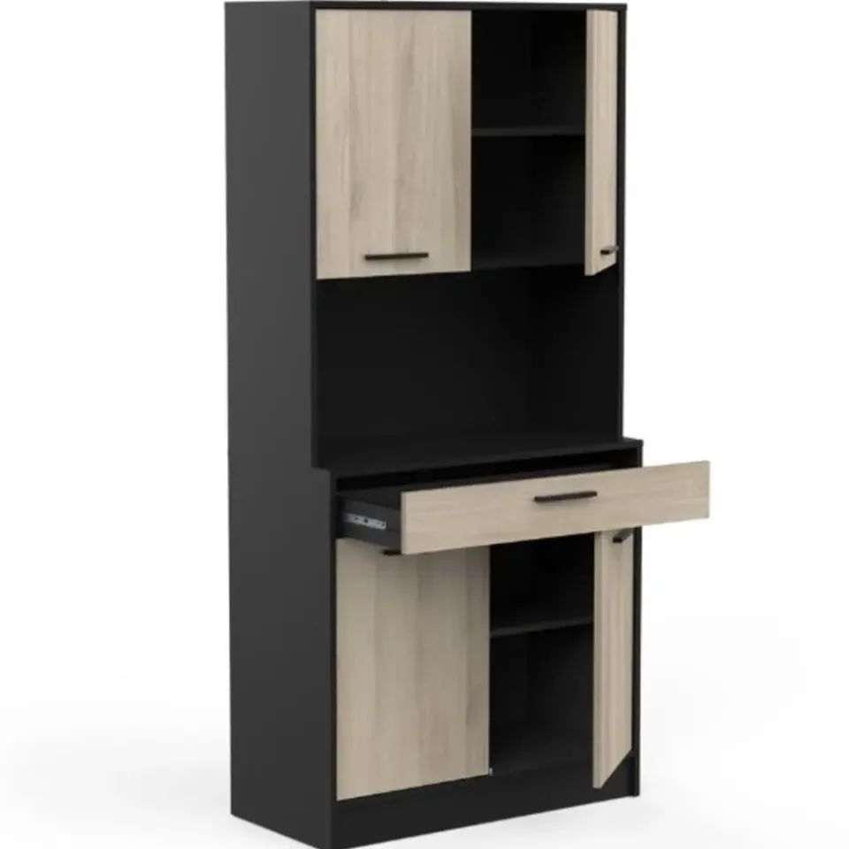 De combinatie van het strakke matzwart en het lichte kronberg eikdecor van buffetkast Romanie is een echte voltreffer. Deze kast beschikt over een lade voor uw bestek en 4 draaideuren met daarachter 2 legplanken voor allerhande keukengerei, kruiden, etc. In het open vak is er plaats voor eventueel een microgolfoven of andere keukenapparaten. Deze kast kan tegen de muur gemonteerd worden, de schroeven en pluggen hiervoor dient u zelf te voorzien.
