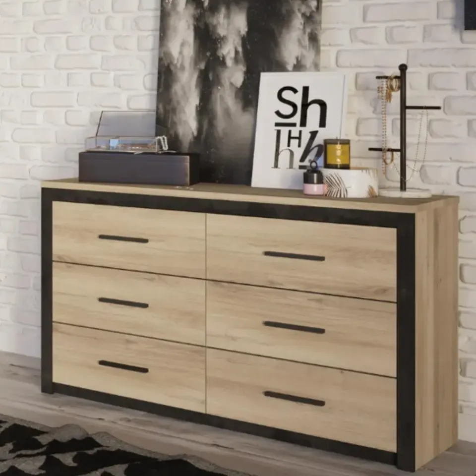 Deze ladekast zorgt dankzij zijn lichte Kronberg eikdecor voor veel lichtinval in de ruimte en de ruwe uitstraling van het Sidewalk zwart geeft het meubel een industriële afwerking. Voeg daar nog eens de matzwarte handgrepen aan toe en u hebt een pareltje! Deze kast biedt met zijn 6 lades een ruime hoeveelheid aan opbergmogelijkheden voor uw kousen en ondergoed. Combineer met de andere meubels uit de Collins-collectie en stel zo uw eigen slaapkamer samen! Schroeven en pluggen voor wandmontage zijn niet inbegrepen.