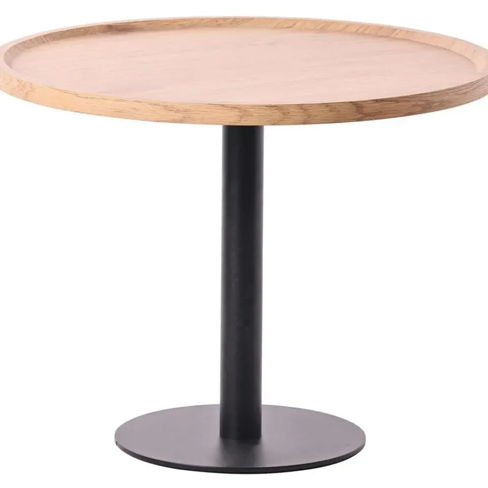 Het ronde houten tafelblad geeft de tafel een natuurlijke, warme uitstraling, terwijl het robuuste, matzwarte, gepoedercoate metalen frame zorgt voor stabiliteit en een moderne uitstraling. Vloerbeschermers beschermen gevoelige vloeren tegen krassen.