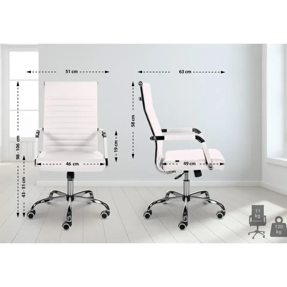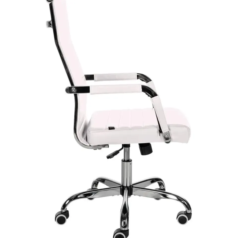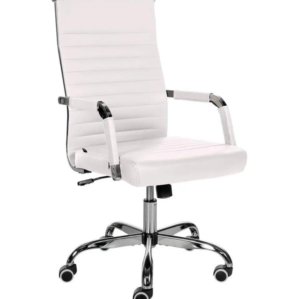 Deze bureaustoel Amadora overtuigt niet alleen met zijn moderne uitstraling, maar ook op het gebied van comfort. De hoogwaardige en onderhoudsvriendelijke kunstlederen bekleding zorgen voor een aangenaam zitervaring, zelfs gedurende meerdere uren. Bovendien is de zithoogte traploos instelbaar en garandeert ergonomisch zitten. Bovendien is de bureaustoel uitgerust met een kantelmechanisme dat meer bewegingsvrijheid biedt. De stabiliteit wordt gegarandeerd door het metalen frame in chroomlook. Met de vijf soepel lopende wielen kunt u zich gemakkelijk en losjes over de vloer verplaatsen. of het nu gaat om harde of zachte ondergrond.