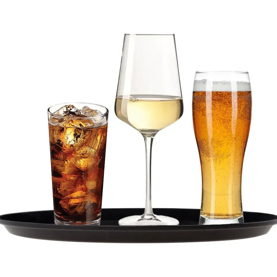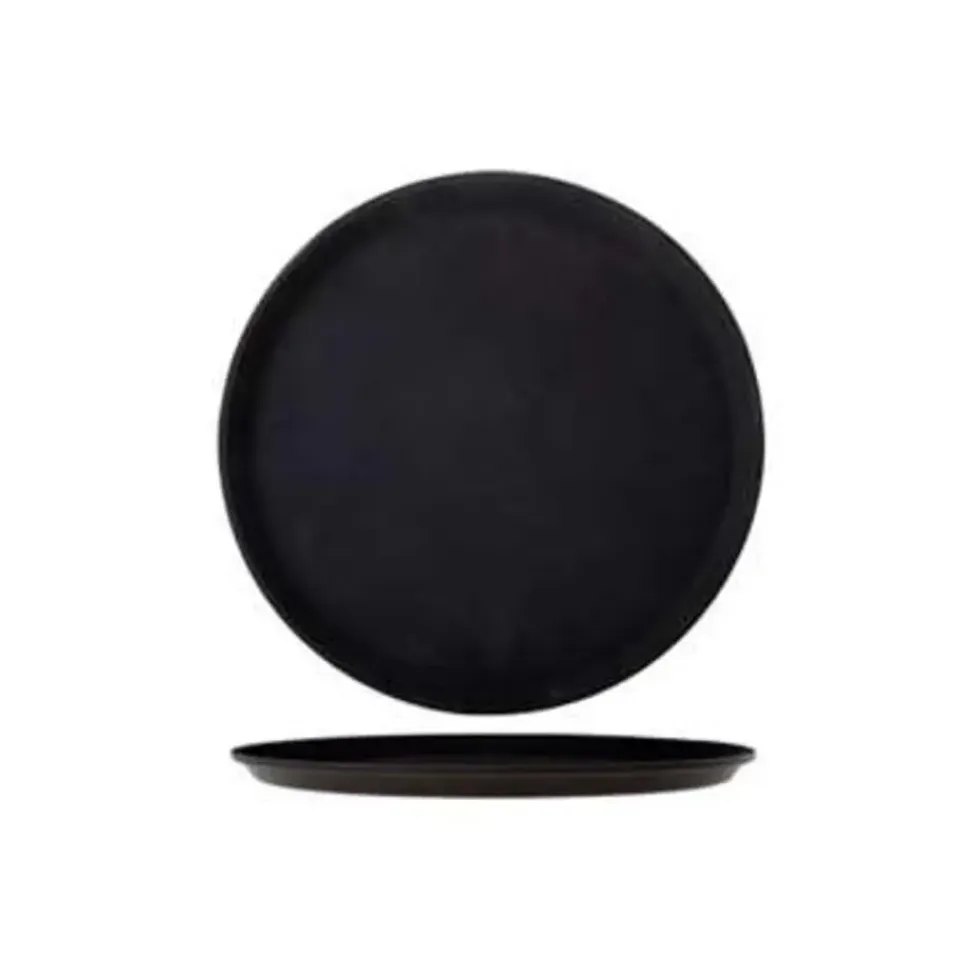 Dienblad met een doorsnede van 35,5 cm. Anti slip, heeft de kleur zwart en is van het materiaal kunststof met anti slip laag.. Door het anti-slip materiaal van het hele blad blijven de glazen stabiel en vallen er minder glazen om als je hiermee loopt en serveert.