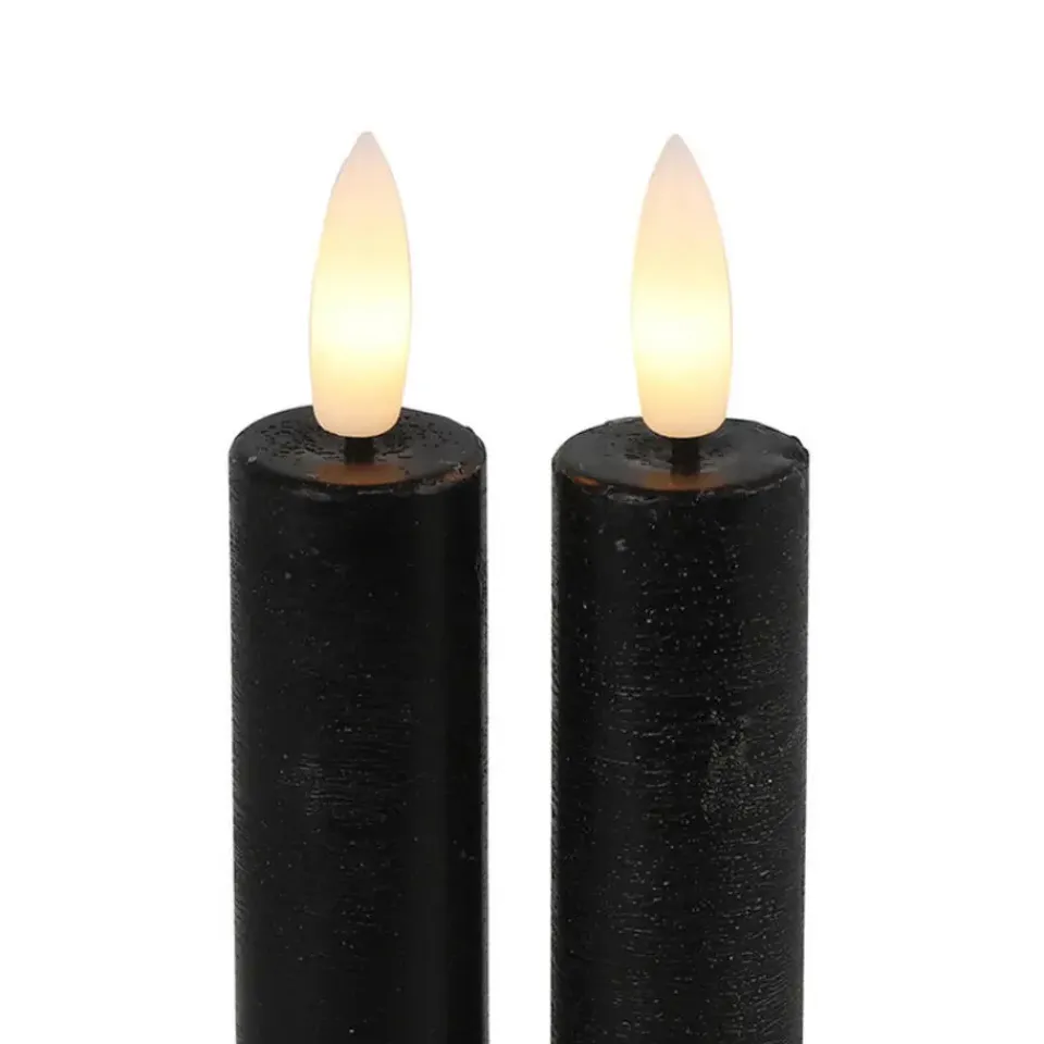 LED dinerkaarsen. Deze LED kaarsen/dinerkaarsen zijn gemaakt van hoogwaardig materiaal met een zwarte afwerking en hebben een hoogte van 15 cm. Met de meegeleverde afstandsbediening kun je de timer en dimmer instellen voor het perfecte licht. De kaarsen zijn per 2x stuks verpakt en zijn veilig te gebruiken, omdat ze geen echte vlam hebben. De kaarsen hebben een diameter van 2 cm. Voeding afstandsbediening: CR2025 knoopcel batterij (inbegrepen) en voeding per kaars: 1x AA batterij (niet inbegrepen).