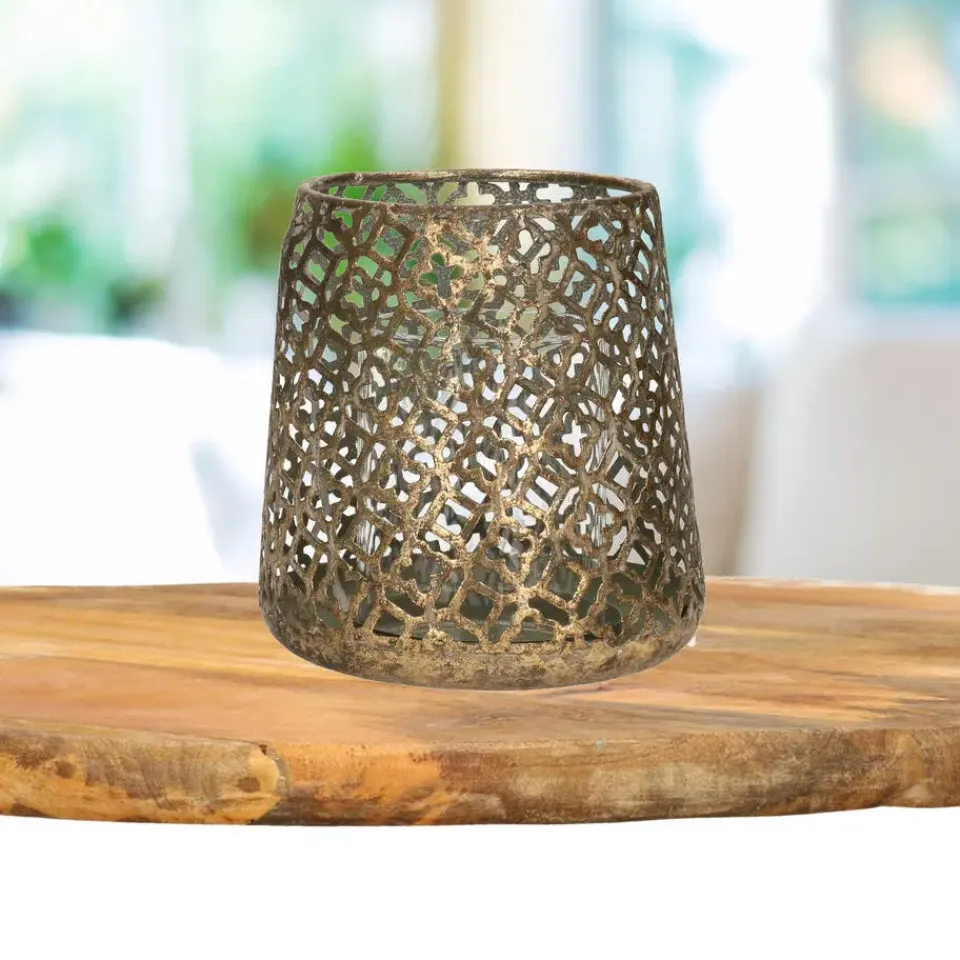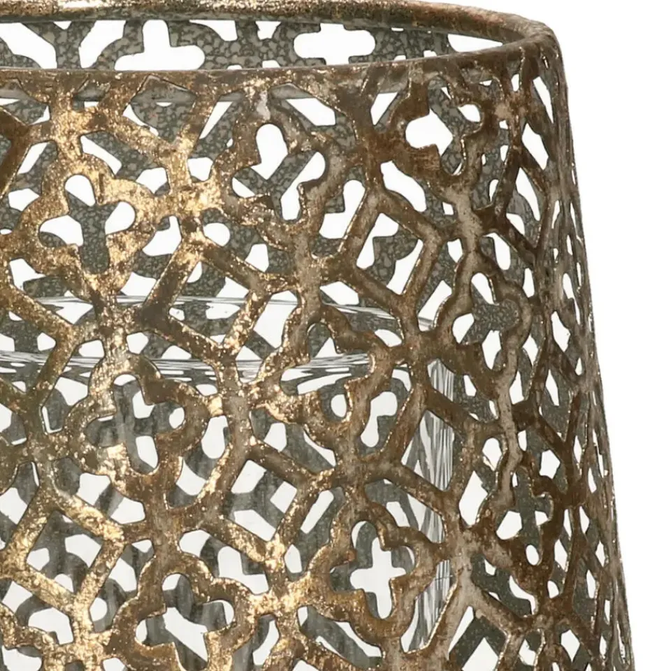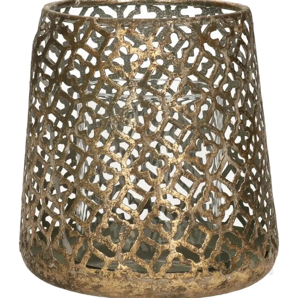 Luxe theelichthouder of kaarsenhouder voor waxinelichtjes met doorschijnend motief, gamaakt van metaal, in de kleur brons. Afmetingen: D12 x H13 cm. Plaats meerdere stuks of formaten van deze serie bij elkaar op tafel of vensterbank een maximale en stijlvolle sfeer. Serie: Morocco.
