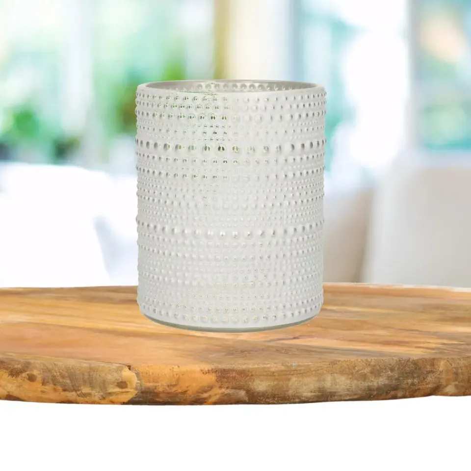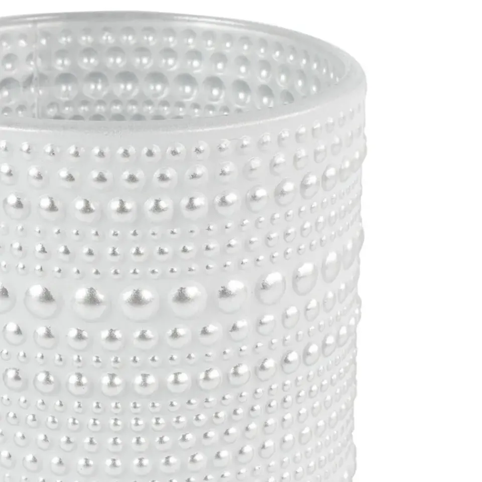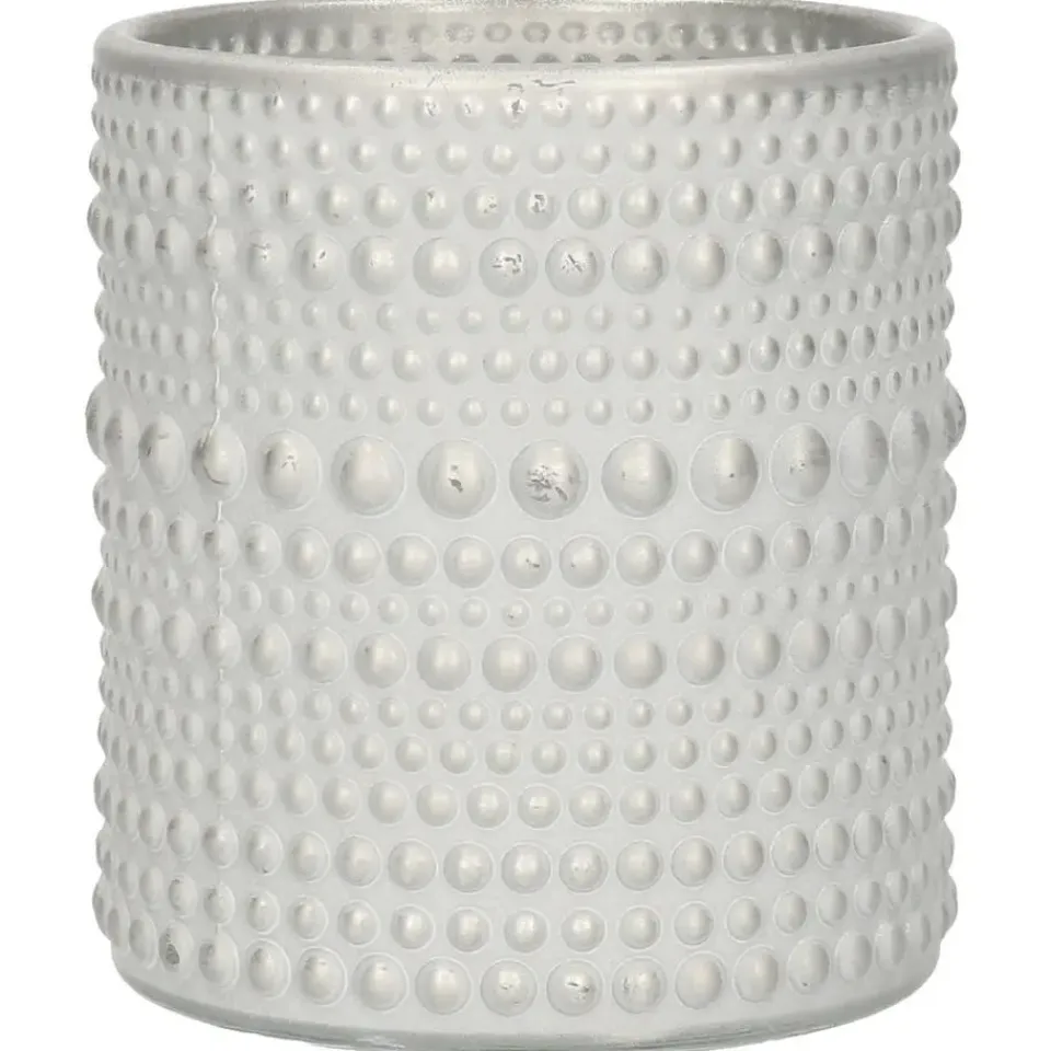 Luxe theelichthouder of kaarsenhouder voor waxinelichtjes van licht doorschijnend relief glas in de kleuren parel wit/zilver. Afmetingen: D8 x H10 cm. Plaats meerdere formaten en of meerdere stuks van deze serie bij elkaar op een kaarsenbord voor een maximale en stijlvolle sfeer. Serie: Aurora.