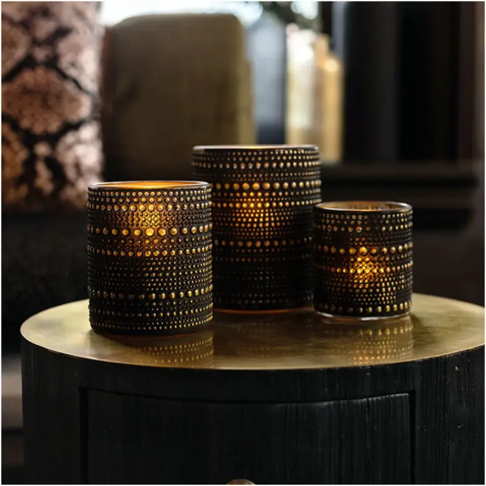 Luxe theelichthouder of kaarsenhouder voor waxinelichtjes van licht doorschijnend relief glas in de kleuren zwart/goud. Afmetingen: D7 x H8 cm. Plaats meerdere formaten en of meerdere stuks van deze serie bij elkaar op een kaarsenbord voor een maximale en stijlvolle sfeer. Serie: Aurora.