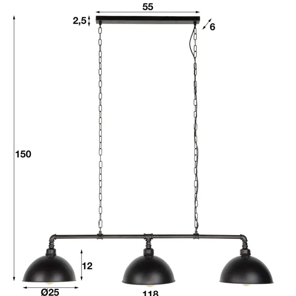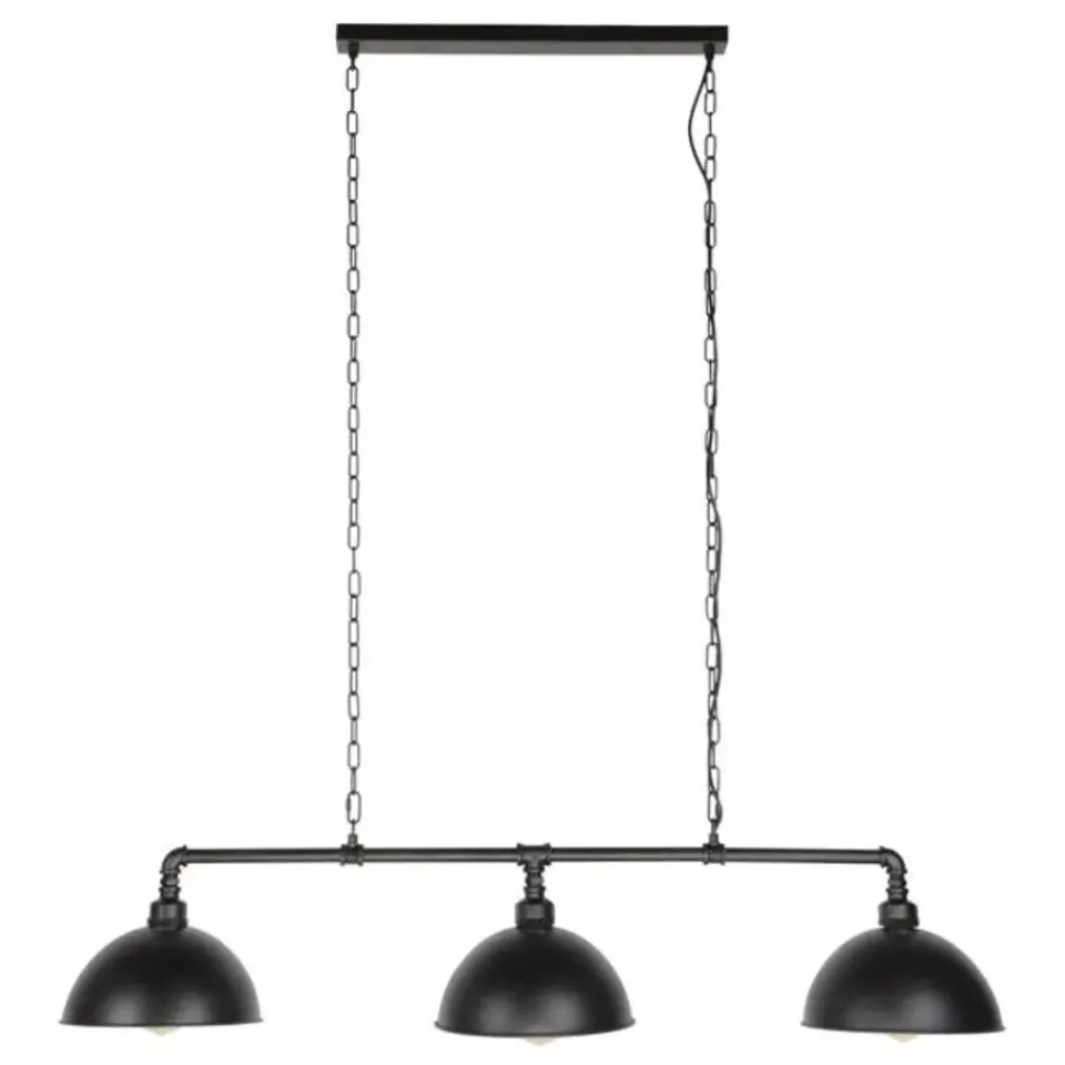Hanglamp Abby is vervaardigd uit waterleidingbuizen en bestaat uit drie zwarte, half open lampenkappen. Middels metalen kettingen hangt de complete lamp aan één plafondbevestiging. De plafondbevestiging bevat dezelfde kleur als de lampenkappen. Gezien de afmeting van deze lamp, past de Abby perfect boven een middelgrote eetkamertafel.