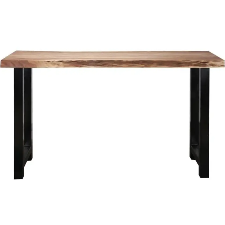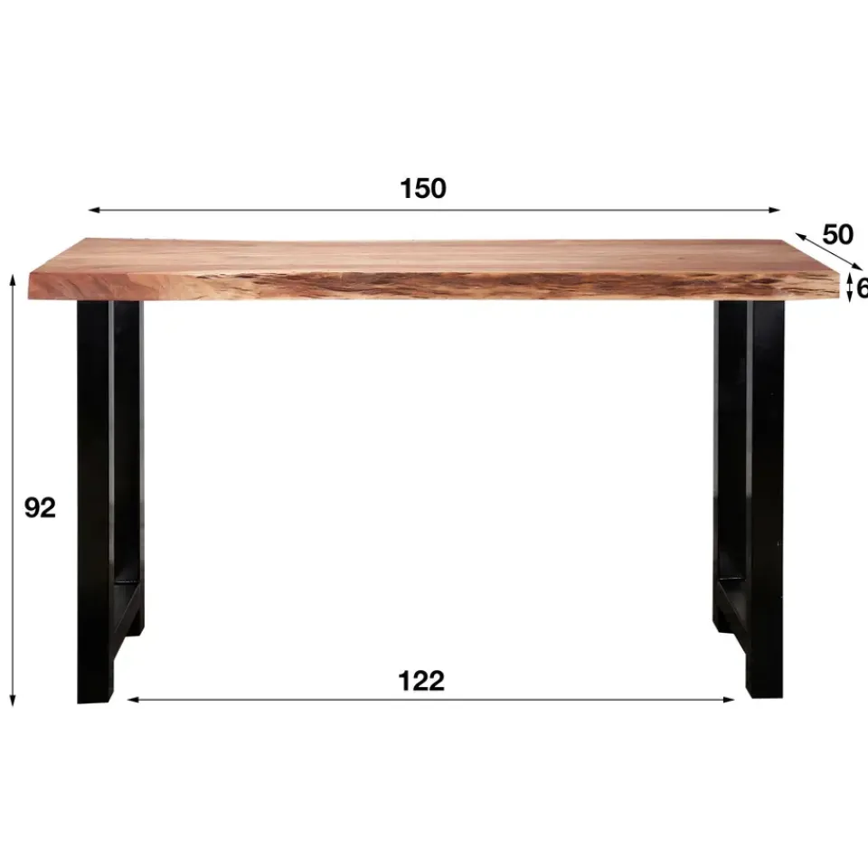Het blad van de tafel is gemaakt van 6 cm dik massief acaciahout. Acacia is een bijzonder duurzame loofhoutsoort. Vooral de fijne nerf, de vlamtekening en de wisselende kleurschakeringen geven het meubel een degelijke en warme uitstraling. Het blad is afgelakt met een blanke lak die de tafel beschermt en een natuurlijke uitstraling geeft.