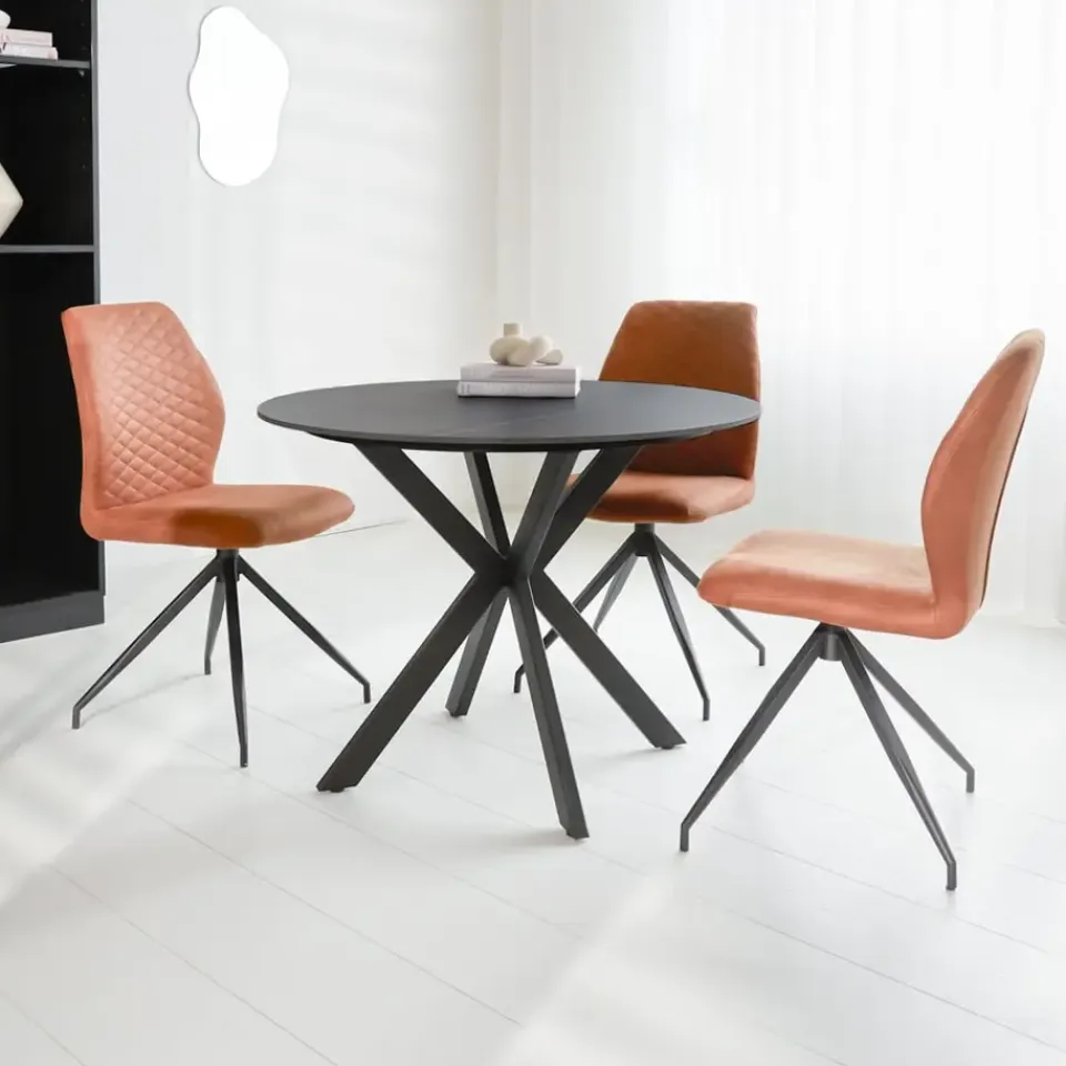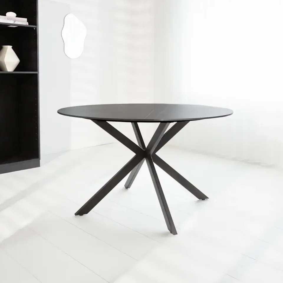 De spinpoot van eettafel Yuna is gemaakt van zwart gepoedercoat metaal. De tafel is gemakkelijk te monteren.