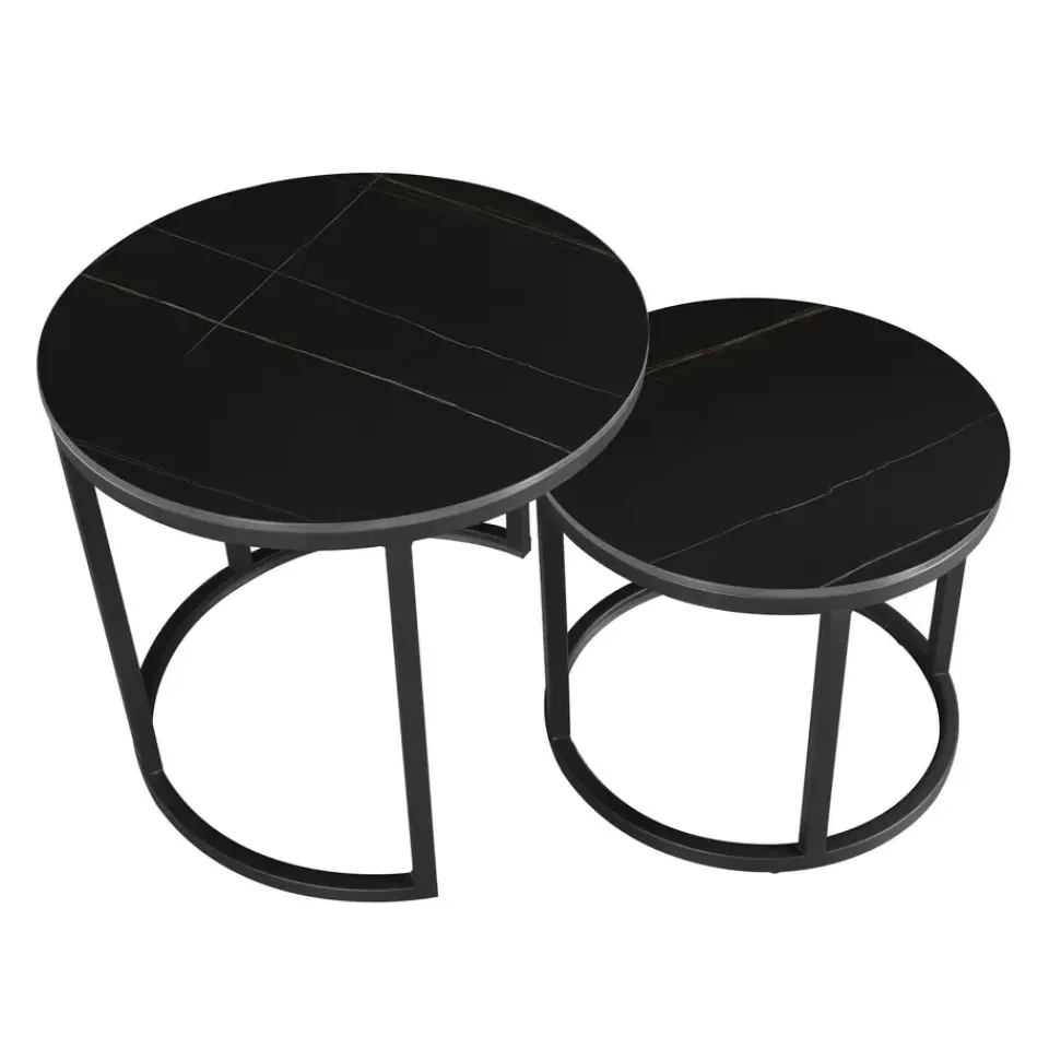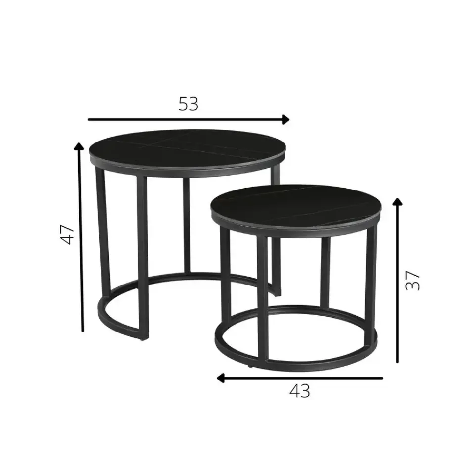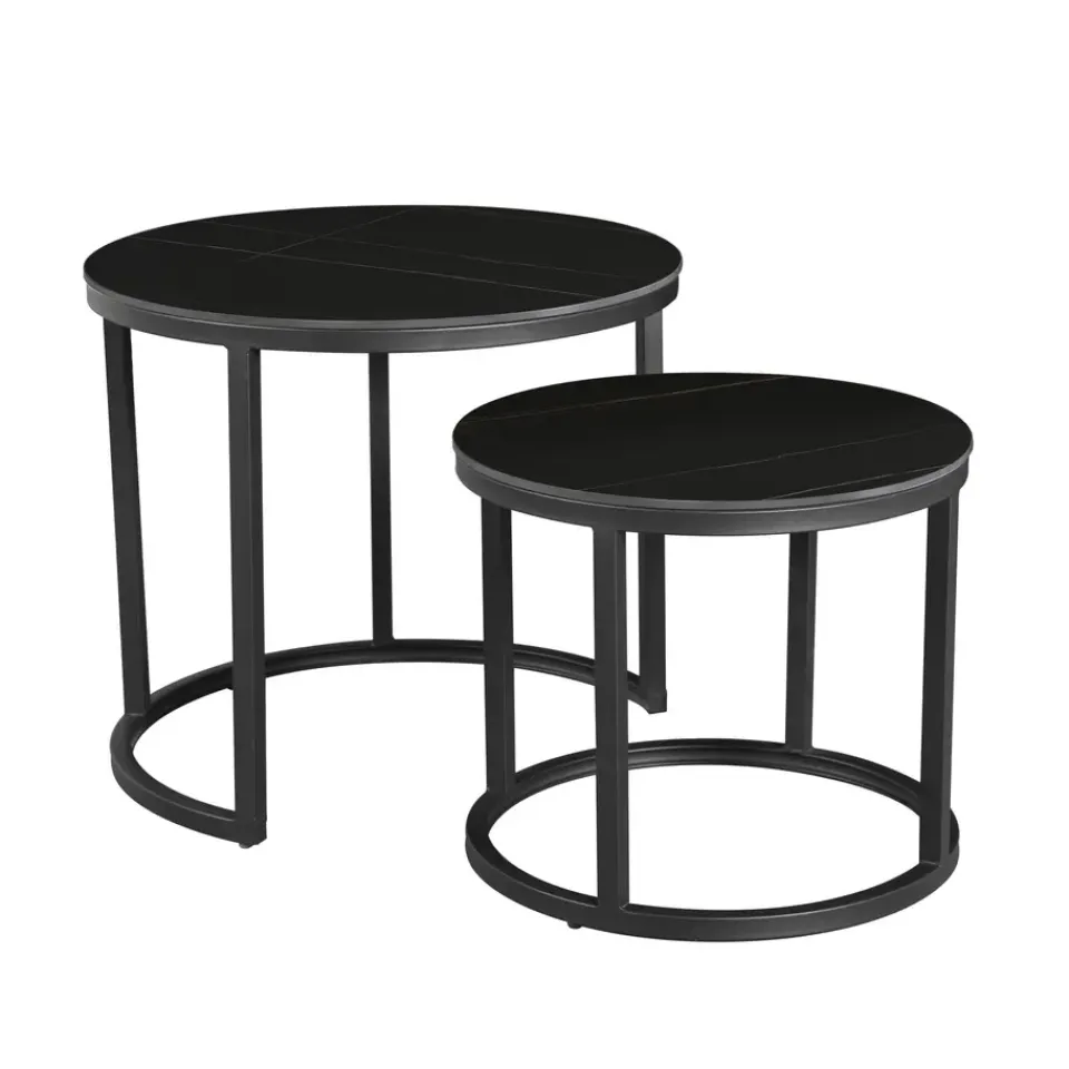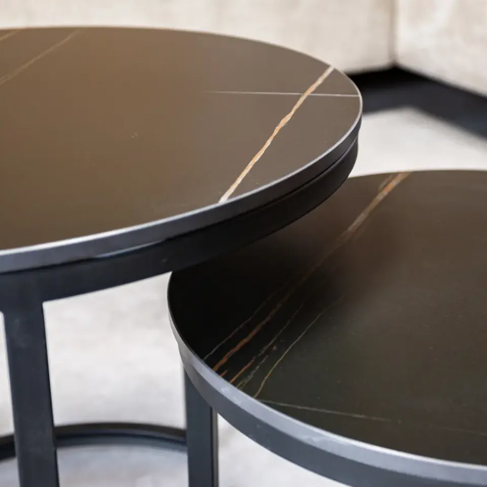 Het framewerk van salontafel set Paige is gemaakt van zwart gepoedercoat metaal. De tafeltjes worden gemonteerd geleverd waardoor je na ontvangst de set alleen maar hoeft uit te pakken en op de juiste plek hoeft te zetten.
