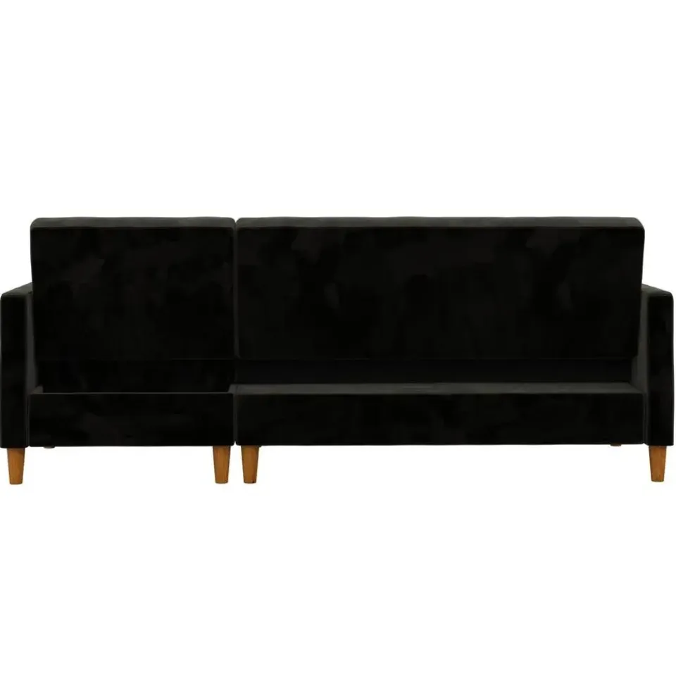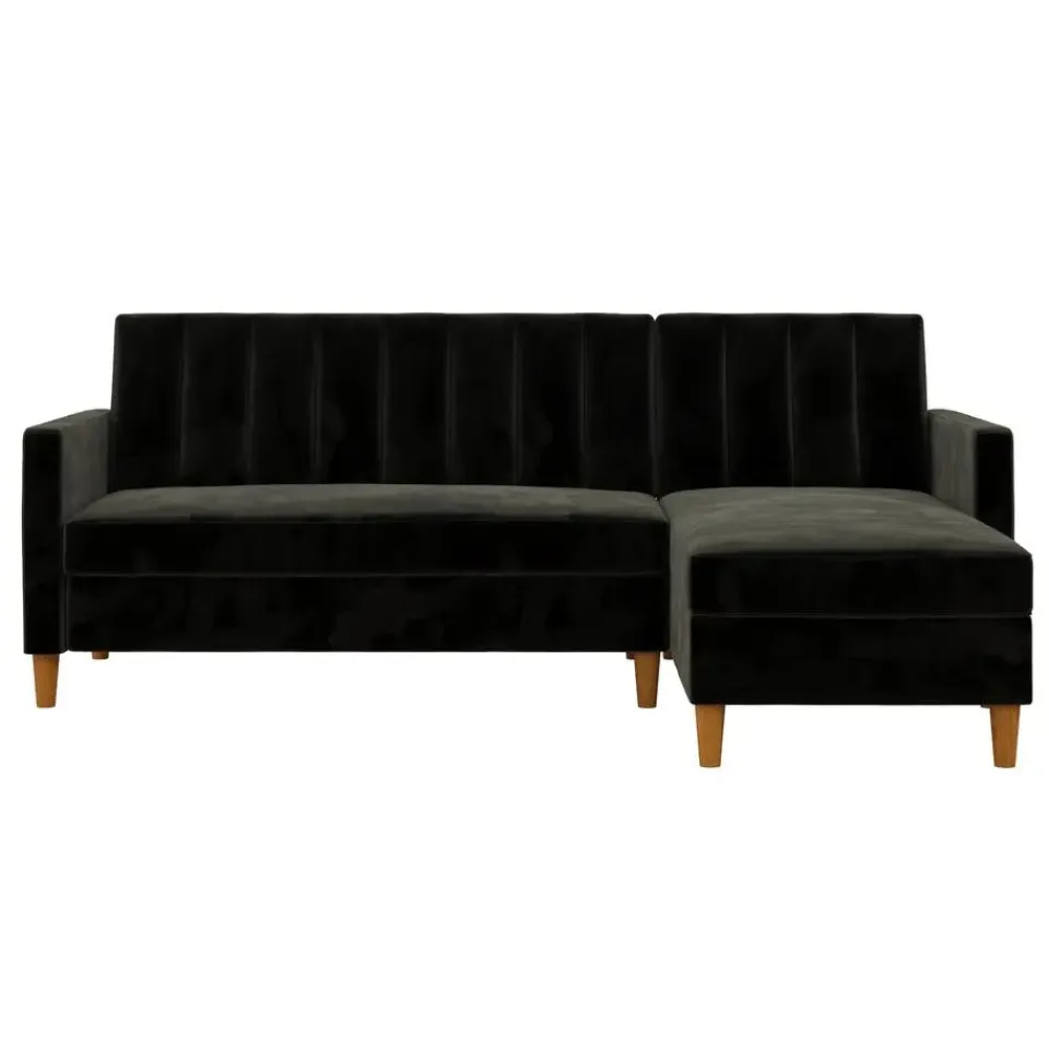 Moderne converteerbare hoekbank met fluwelen bekleding en verticale stiksels in de rugleuning.