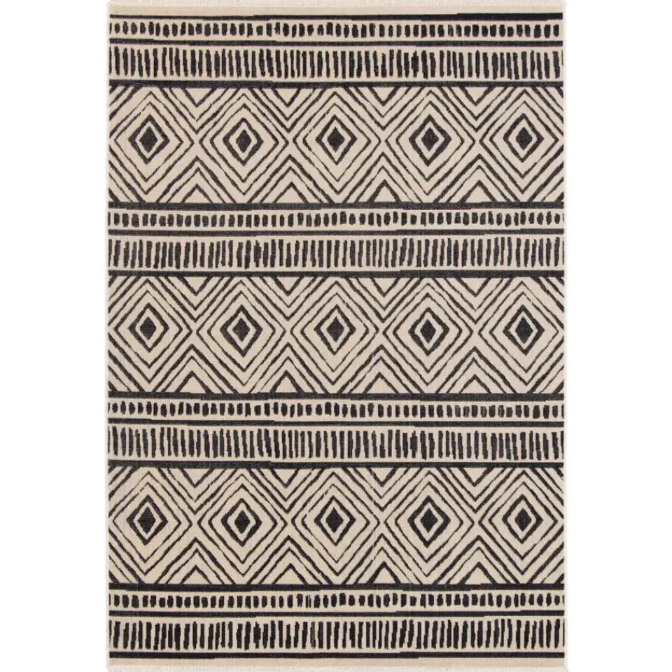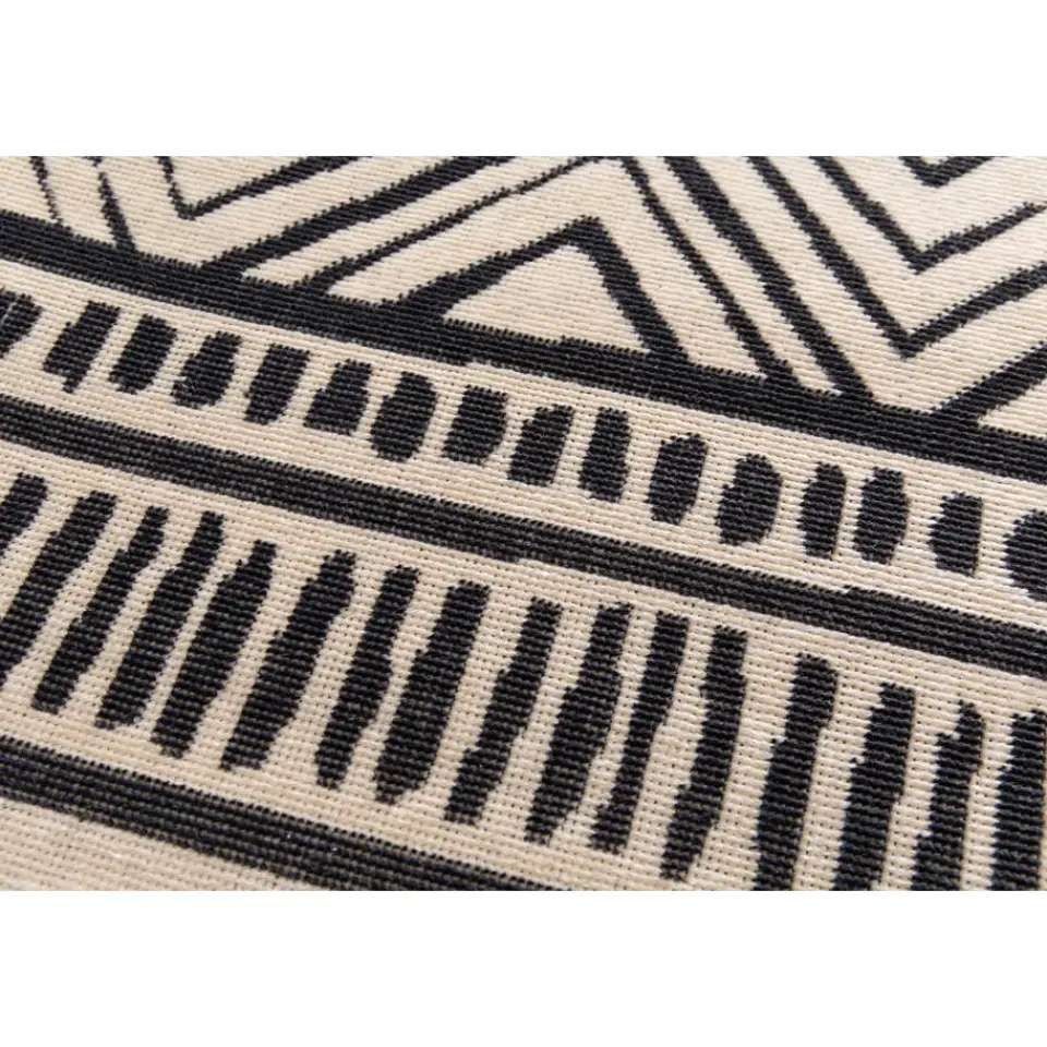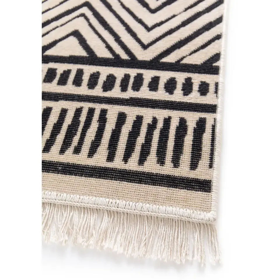 Met zijn intrigerende geometrische patronen in zwart en beige geeft het elke ruimte een moderne, etnische touch. Dit vloerkleed is vervaardigd uit een duurzame combinatie van 40% polypropyleen, 40% gerecycled katoen en 20% gerecycled polyester. Deze mix maakt het vloerkleed niet alleen robuust en slijtvast, maar ook milieuvriendelijk.