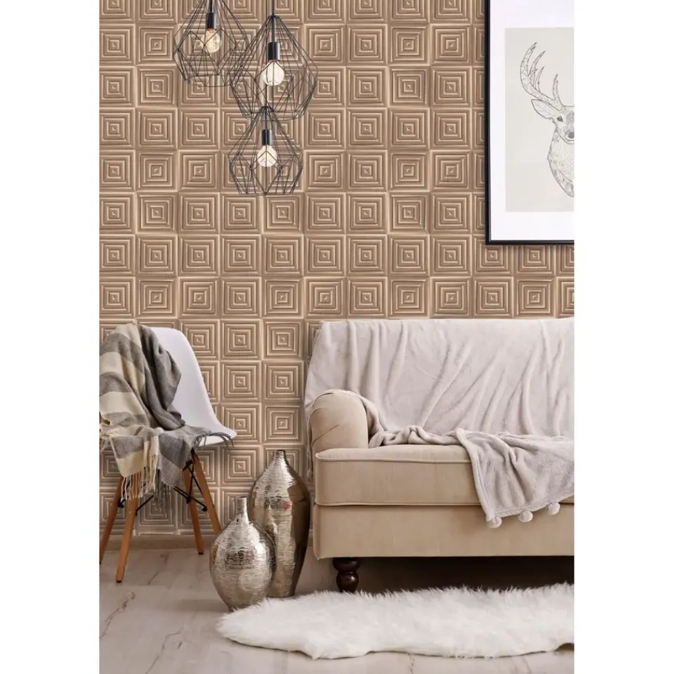 Behang met vierkanten, de diagonale lijnen en afwijkende kleurtinten zorgen voor een subtiel optisch bedrog effect.