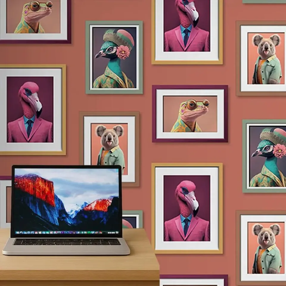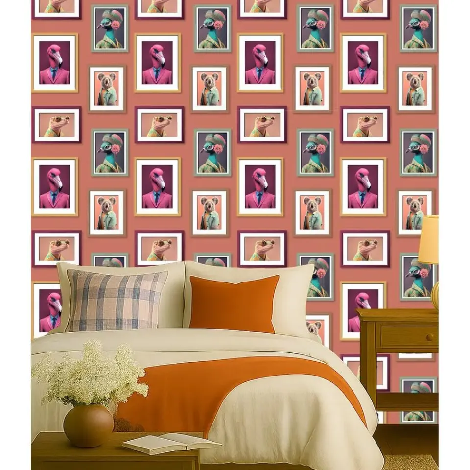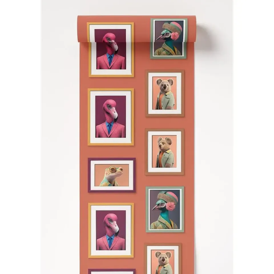 Het Artifice-vliesbehang met lijstjes en dieren in terra/multi brengt een vrolijke en artistieke sfeer in elke ruimte. De warme terrakleurige achtergrond vormt een perfect contrast met de speelse en kleurrijke portretten van dieren in unieke outfits. Dit behang is ideaal voor het creëren van een opvallende accentmuur in kinderkamers, creatieve werkplekken of elke ruimte die een vleugje humor en stijl kan gebruiken. Het vliesmateriaal zorgt voor eenvoudige plaatsing en een naadloze afwerking, waardoor dit behang niet alleen mooi is, maar ook praktisch en duurzaam. Een unieke keuze voor een eigentijds interieur.