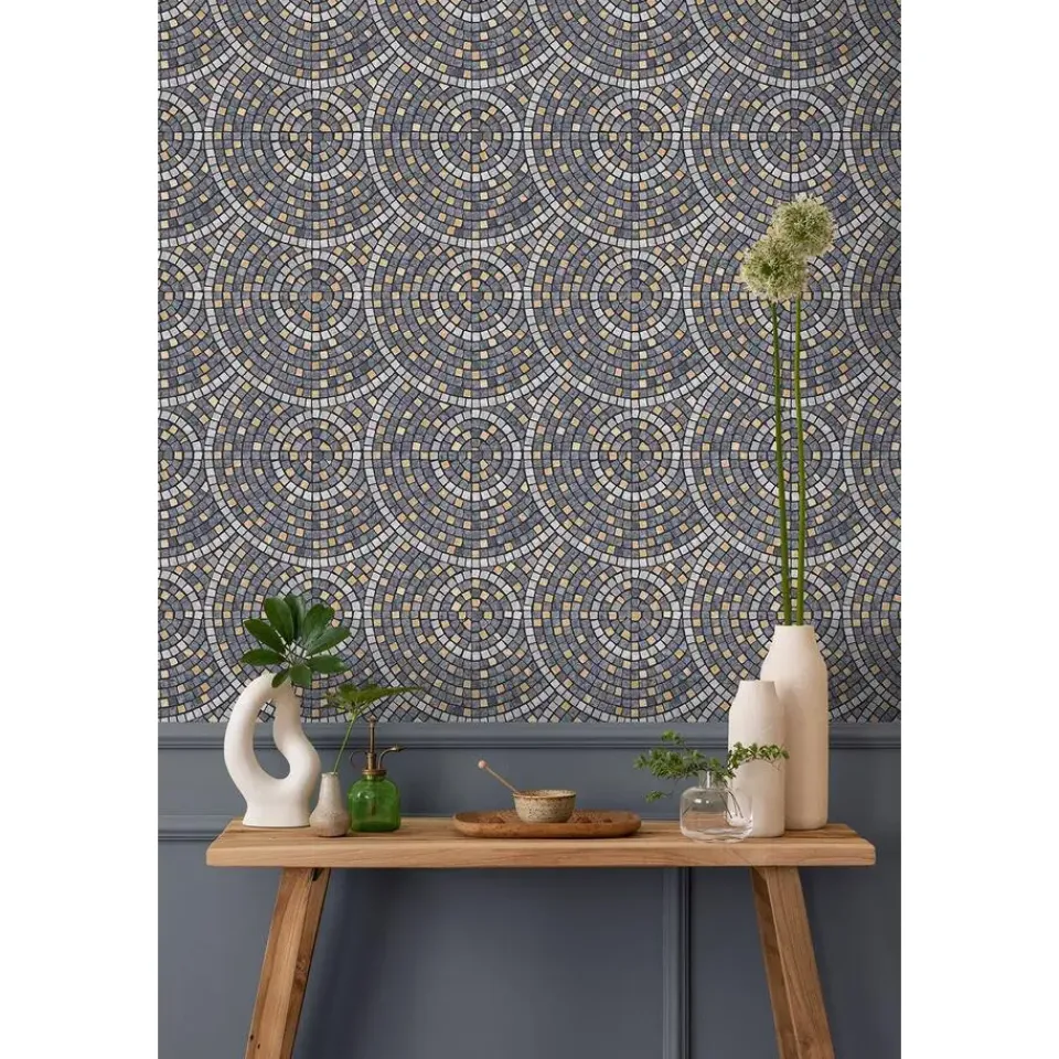 Het Artifice-vliesbehang met mozaïektegelmotief in donkergrijs en oker biedt een verfijnde en moderne uitstraling voor elke ruimte. De combinatie van diepe grijstinten en warme okerkleurige accenten creërt een dynamisch en visueel aantrekkelijk patroon dat perfect is voor accentmuren of als eyecatcher in een kamer. Dit behang brengt een gevoel van diepte en textuur, terwijl het toch subtiel blijft in zijn elegantie. Ideaal voor woonkamers, gangen of badkamers, het vliesbehang is eenvoudig aan te brengen en duurzaam. Het voegt een tijdloze stijl toe aan je interieur, met een vleugje luxe en verfijning.